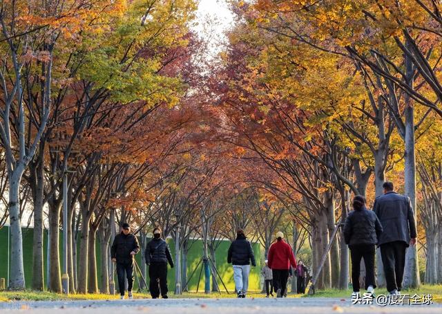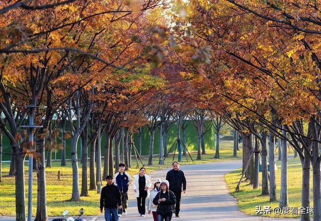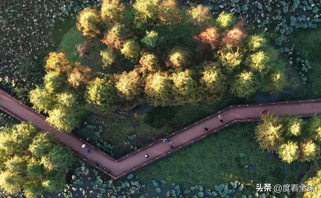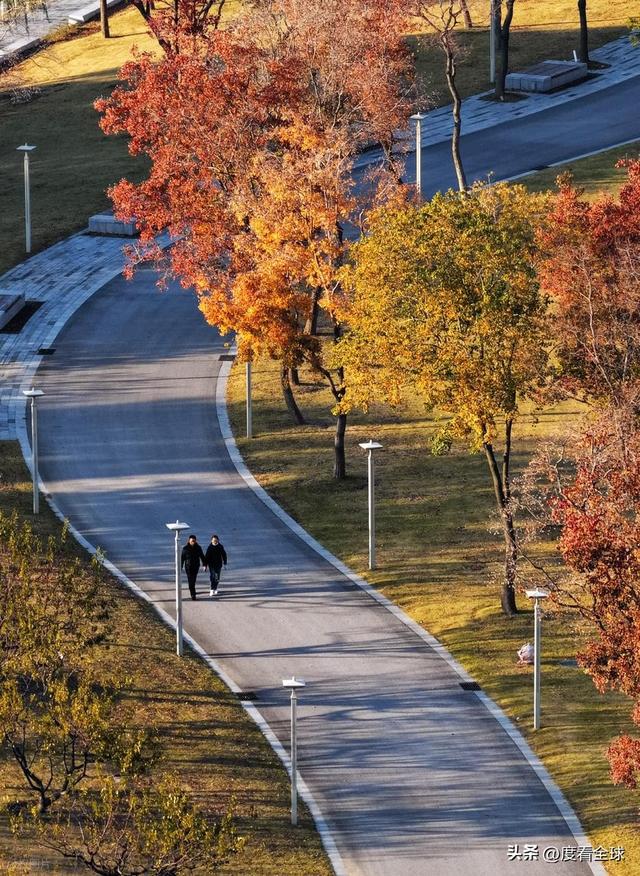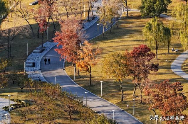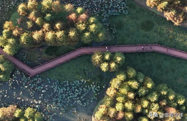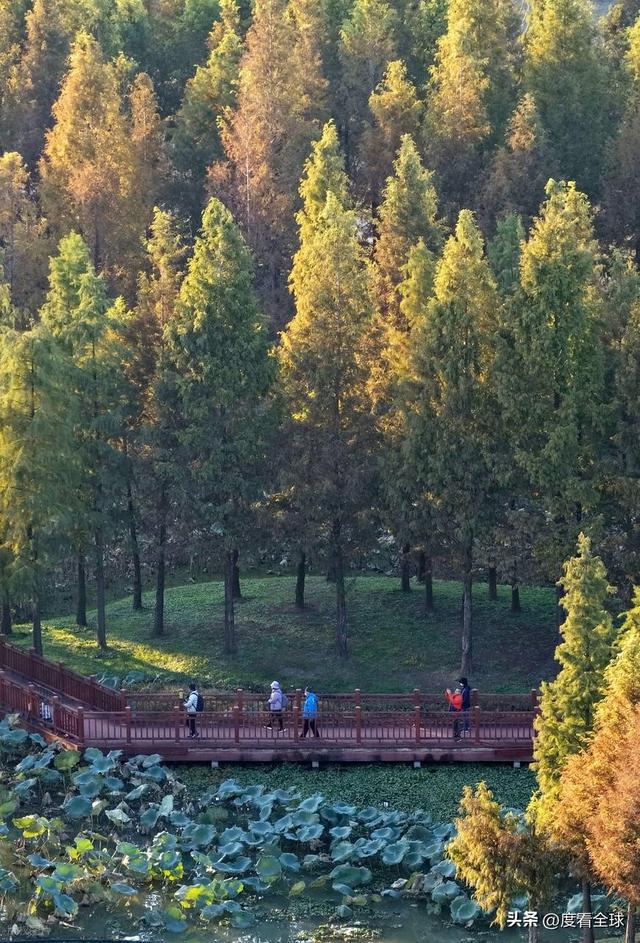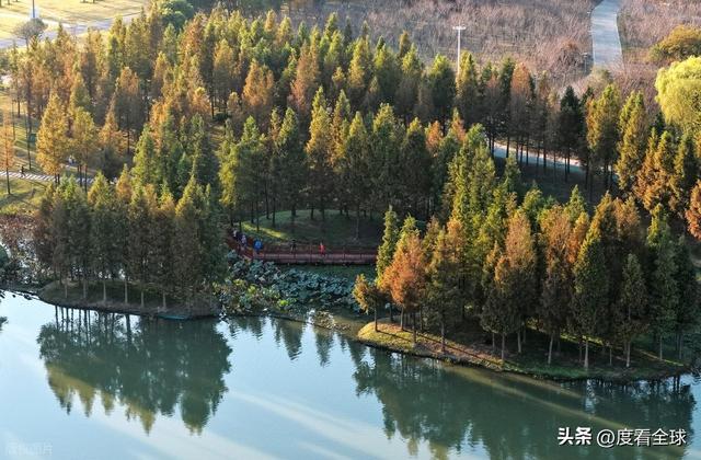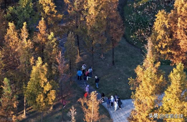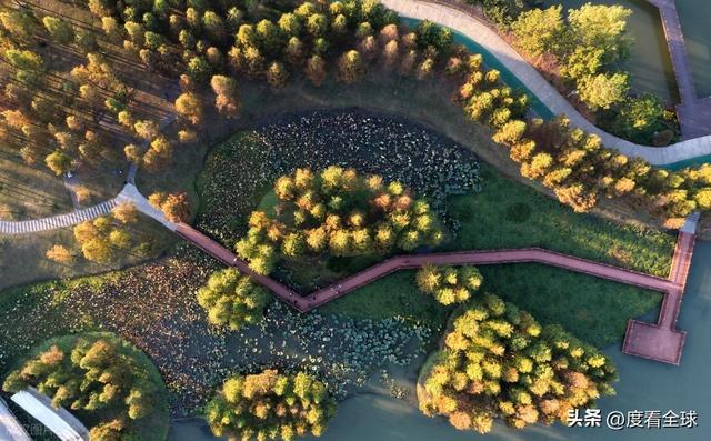 沿着 3 公里环形健身步道前行,脚下是松软的落叶,身旁是层次分明的林木:水杉与池杉挺拔如火炬,深绿、浅红、赭黄的叶片在阳光下熠熠生辉;银杏树枝繁叶茂,金黄的叶片随风飘落,在地面铺就绵延数百米的 “黄金大道”;乌桕树则独具风情,同一枝丫上竟能生出红、黄、绿三色叶片,宛如大自然精心调配的调色盘。
