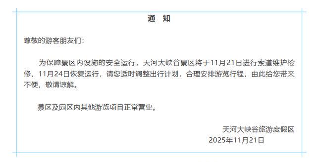 11月21日,记者从天河大峡谷景区了解到,为保障景区内设施的安全运行,天河大峡谷景区今日(11月21日)进行索道维护检修,11月24日恢复运行,景区及园区内其他游览项目正常营业。