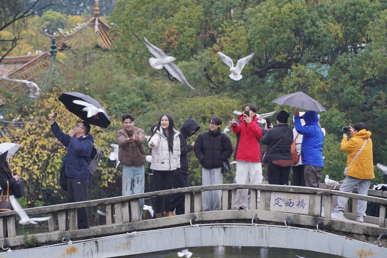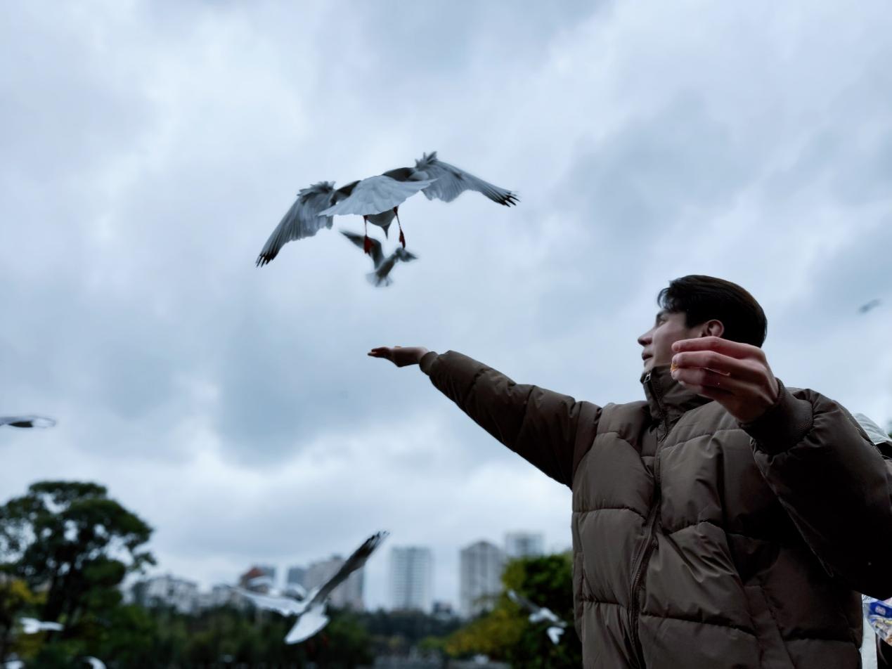 "太迷人了!我是第一次近距离地看到这么多海鸥!"拥有200多万粉丝的老挝知名博主Jojo激动地与这群"冬日精灵"合影,试图定格每一个互动瞬间。在翠湖畔,博主们与市民一同迎接这群来自远方的朋友。人鸥和谐共处的场景,成为他们眼中云南生态友好与城市温度的深刻注解——这里不仅是地理意义上的"春城",更是充满温情的宜居之地。