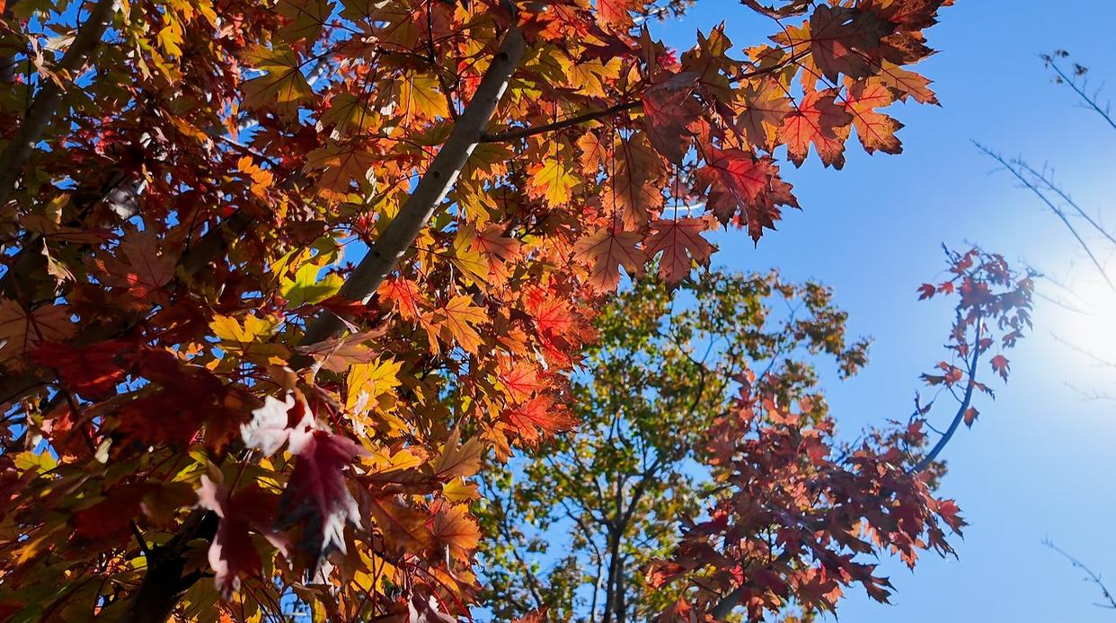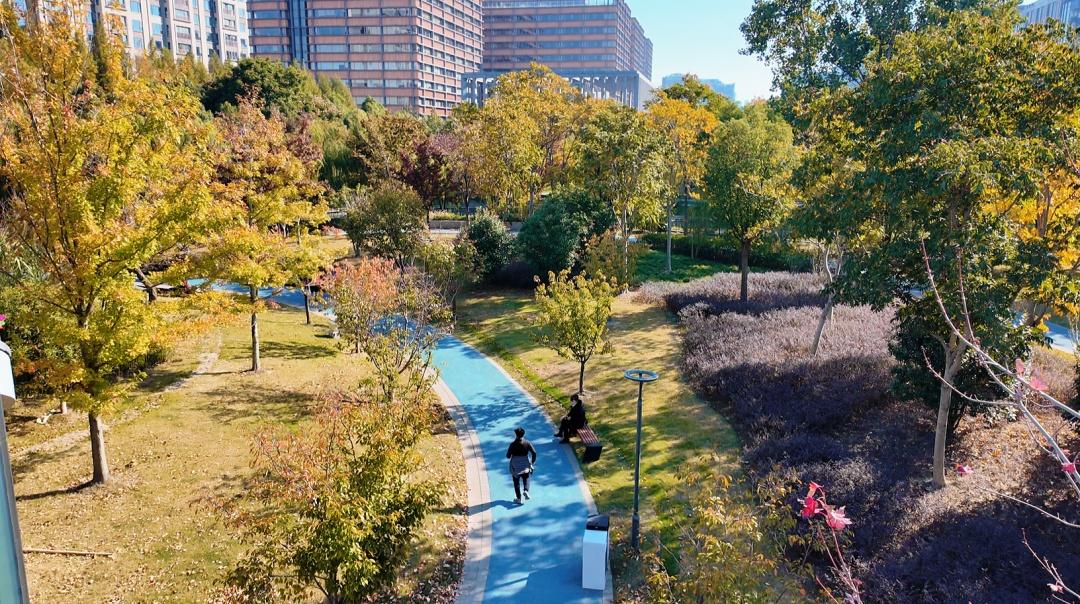 走进位于真北路云岭东路的半马苏河云岭公园,阳光透过稀疏的云层,为满园的树木披上了一层暖融融的光晕。在阳光映衬下,北美红花槭、无患子、乌桕等树木的叶片闪耀着惹眼的红色、橙色与黄色,交织出一片斑斓景象,随手一拍便是充满诗意的“大片”。