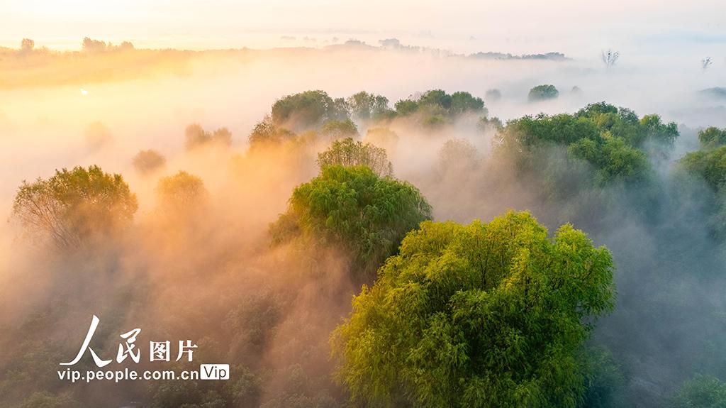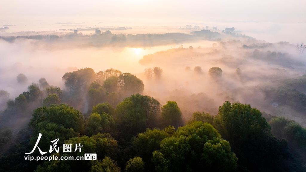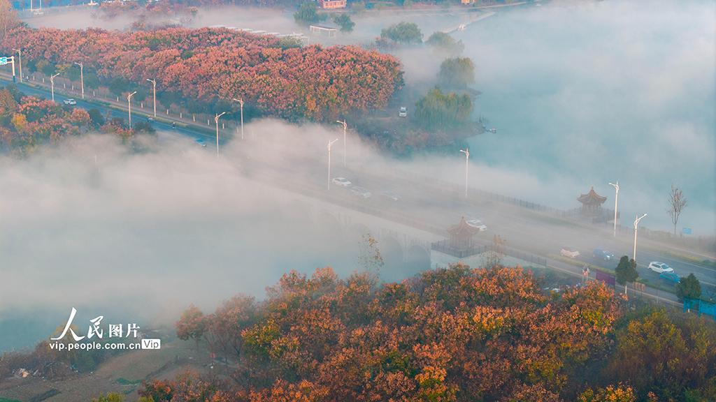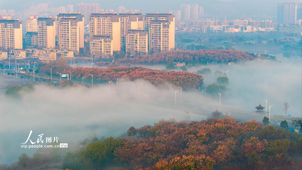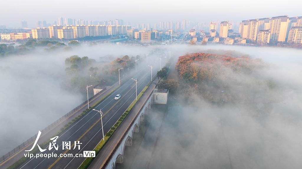 2025年11月21日清晨,安徽省淮北市东湖湿地公园出现壮丽云海景观,缭绕的云雾在湖面、林间、道路与城市楼宇间流动,与晨光相映,构成一幅美丽的山水画卷。王文摄(人民图片网)