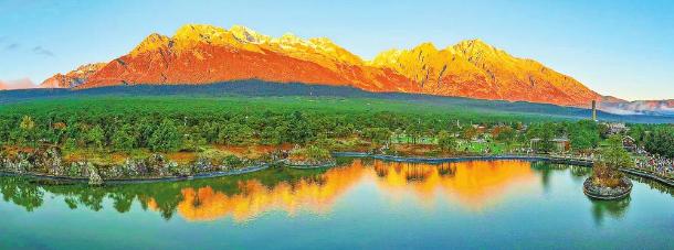 在丽江,观赏“日照金山”的地点众多。甘海子、蓝月谷等地可近距离感受雪山的巍峨壮丽;狮子山观景台能俯瞰古城、遥望雪山;黑龙潭公园则是摄影师钟爱的经典机位——金色的山峰倒映潭中,与亭台楼阁相映成趣,“双份”美景令人沉醉。