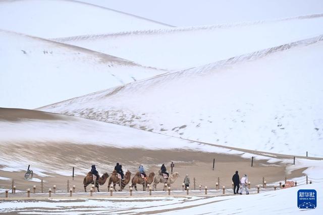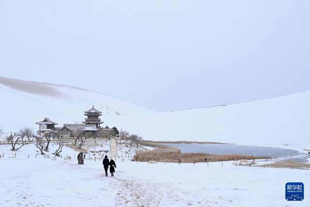 11月23日,受冷空气影响,甘肃省敦煌市迎来降雪,当地著名景点鸣沙山月牙泉银装素裹,美不胜收。