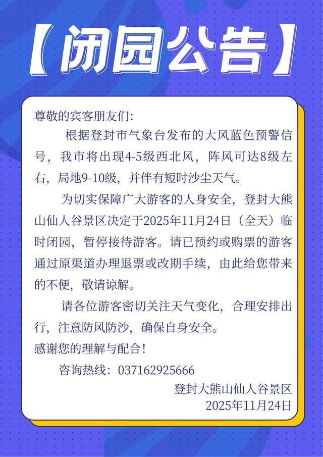 11月24日,记者从登封大熊山仙人谷景区获悉,为应对大风天气,景区定于11月24日(全天)临时闭园,暂停接待游客。