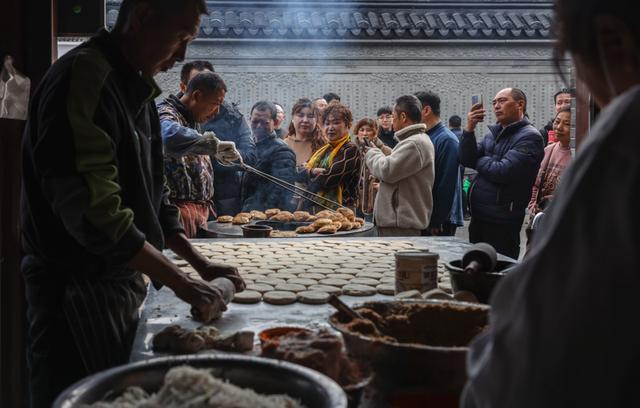 2024年2月13日,游客在江苏省南通市如东县栟茶古镇的一柱楼烧饼铺前排队购买。新华社发(江艺 摄)