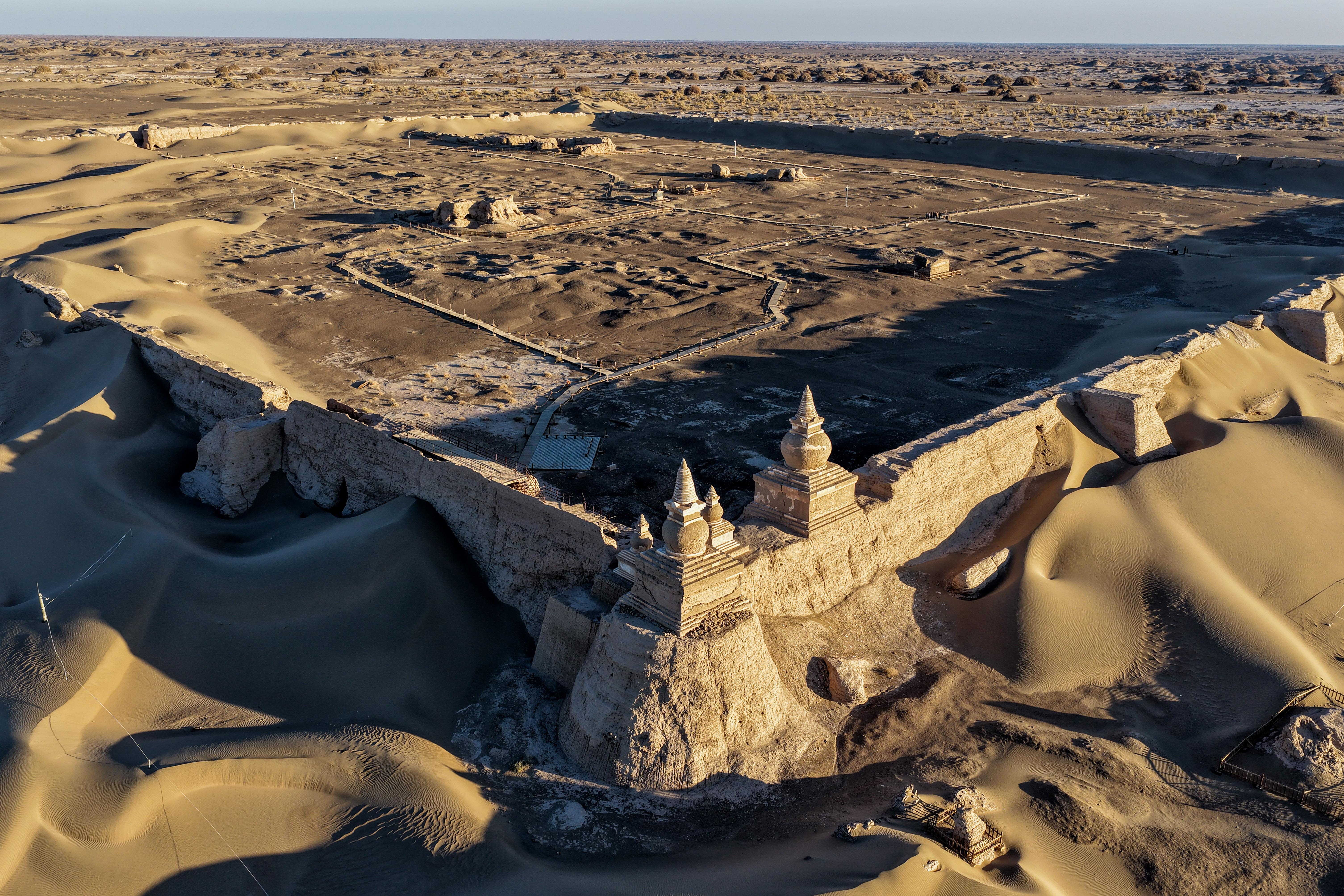 “考古发现黑水城包含大小两座城址,小城是西夏黑水镇燕军司故城,大城是元代扩建的亦集乃路故城,城内有店铺、民居,城外还有佛塔和清真寺,这里是多元文化交融之地。”李靖说,“很可惜随着历史变迁,城内大部分建筑都不存在了,只有西北角的城墙上还耸立着5座佛塔。”