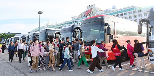 9月29日,韩国仁川港国际邮轮码头,中国游客前往巴士。(视觉中国)