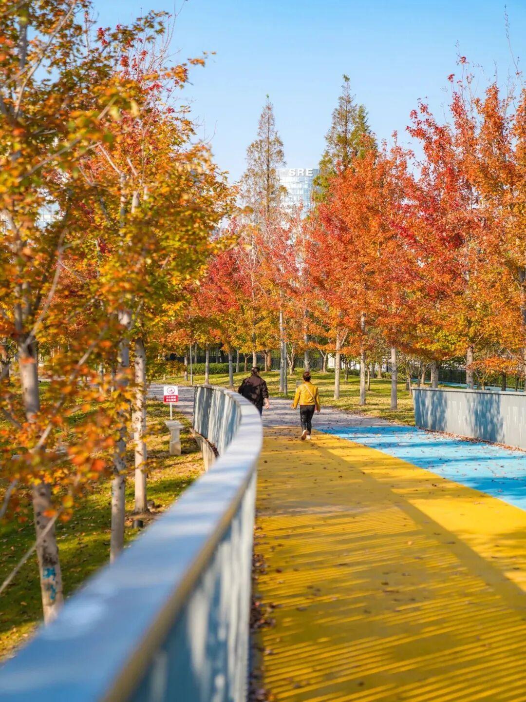 云岭公园天桥以独特且浓郁的撞色吸引众多游客打卡。市民朋友们在游览公园时,不妨来天桥逛逛,既能顺路横跨公园南北两侧,又能从高处一览云岭公园整体秋景。