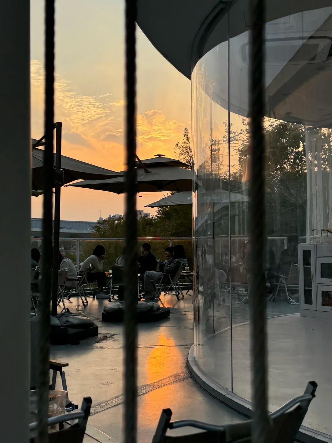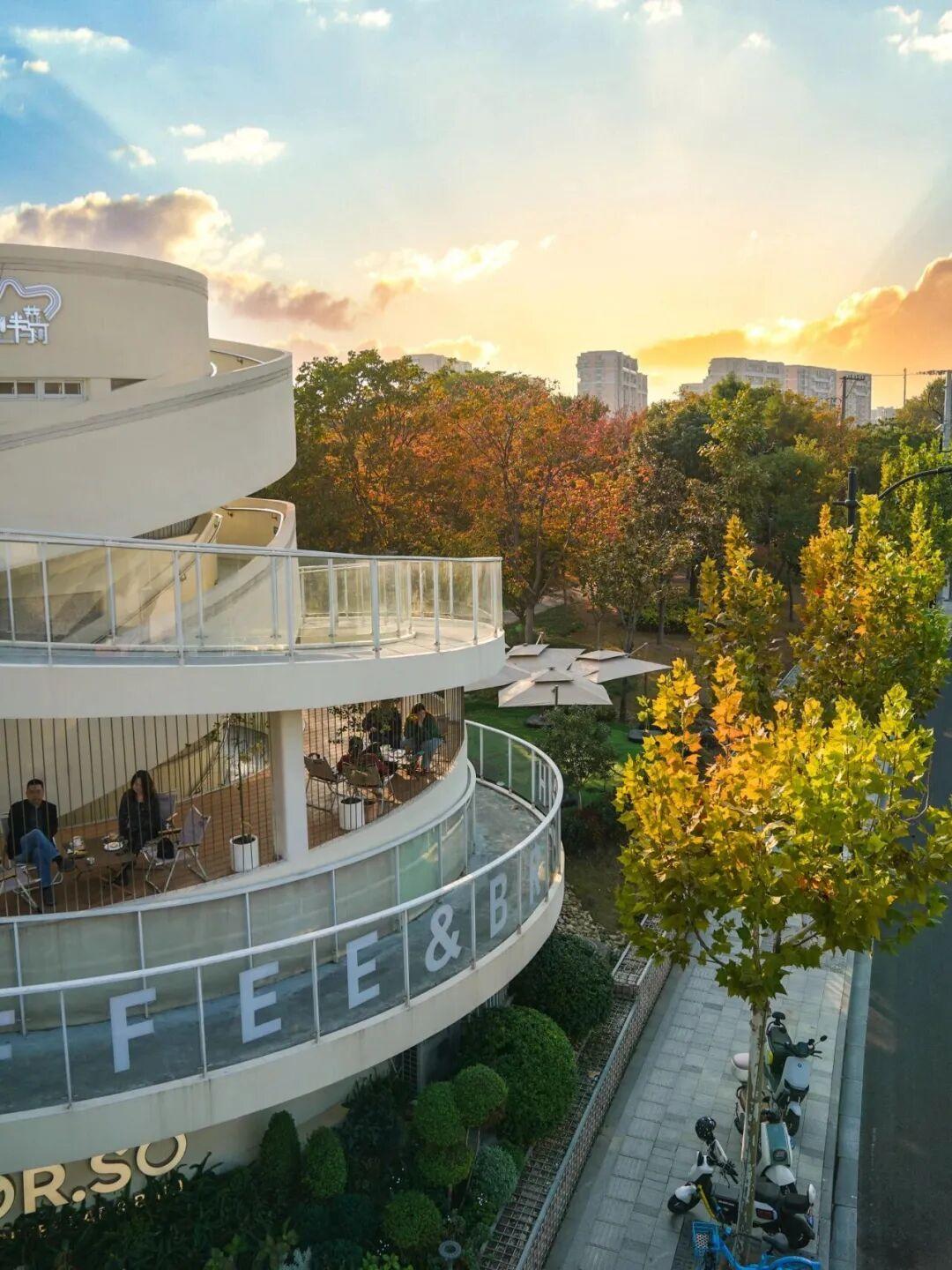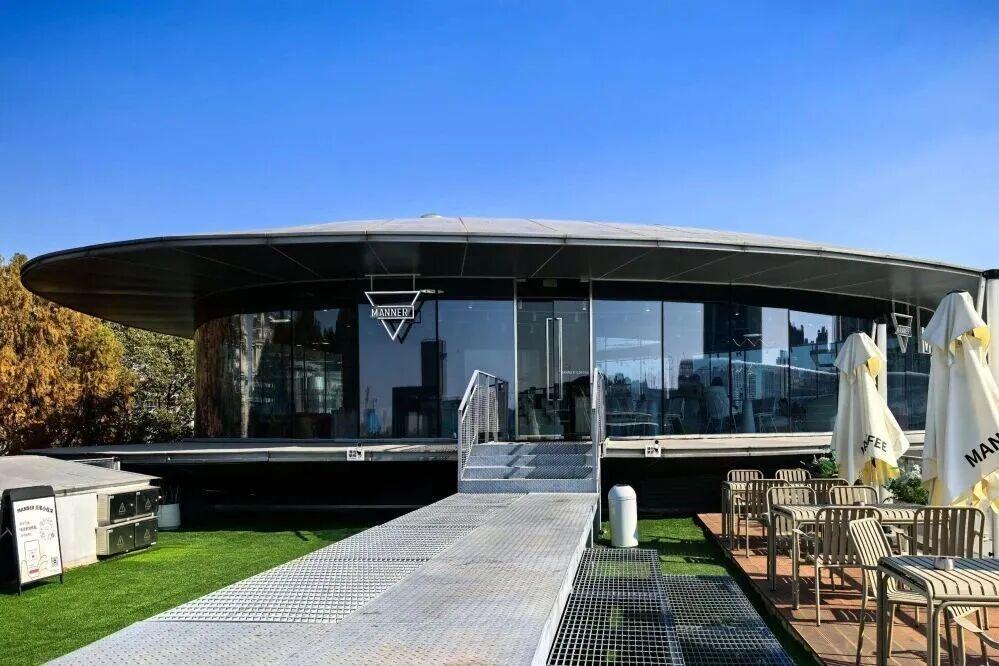 manner(苏州河工业文明展示馆店)的“飞碟”造型也太酷了。坐白色圆柱电梯到三楼,推开门直接被惊艳到!