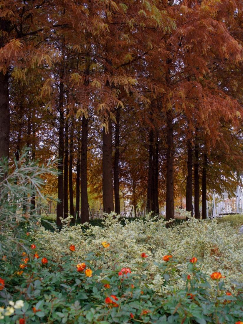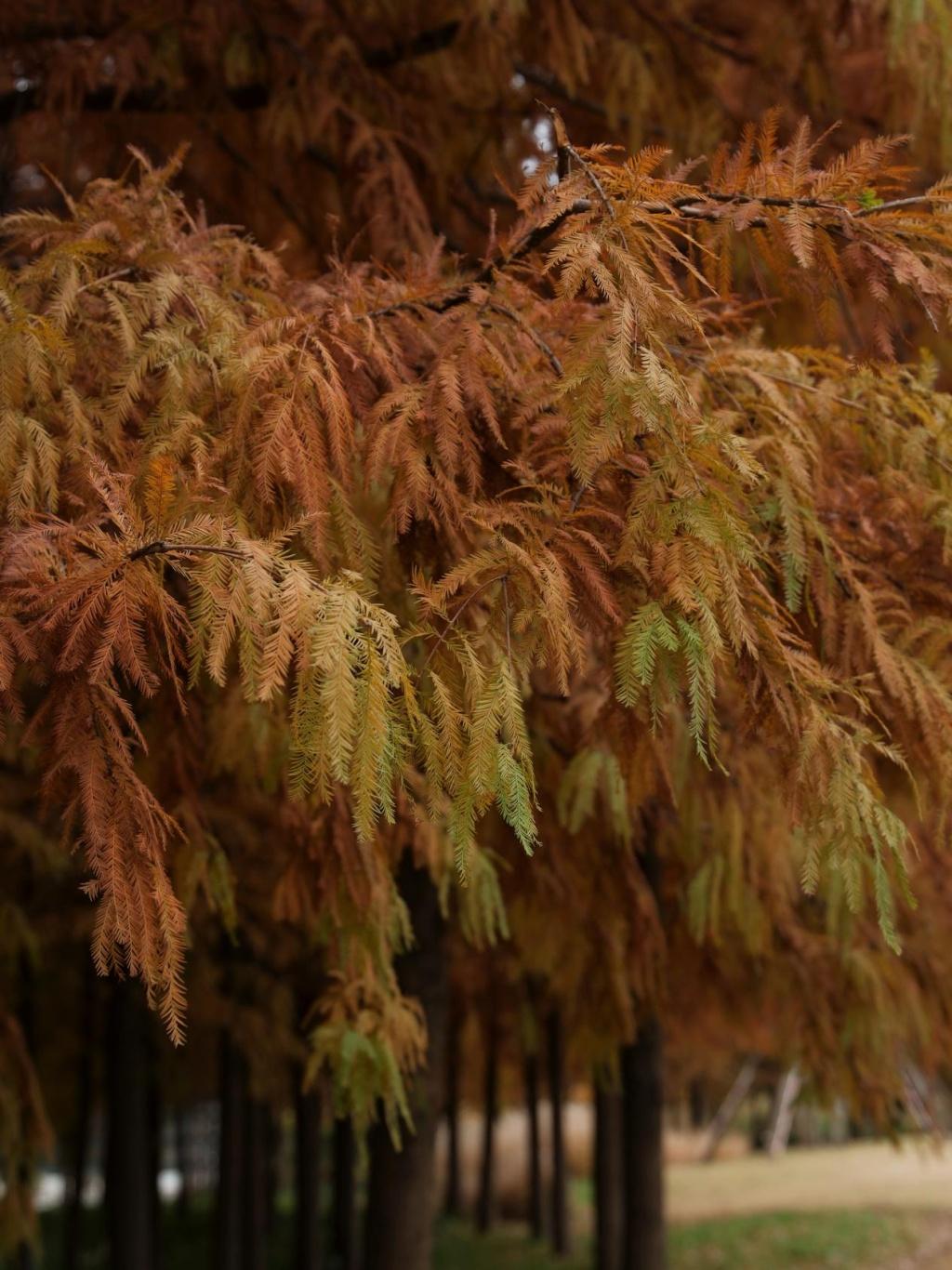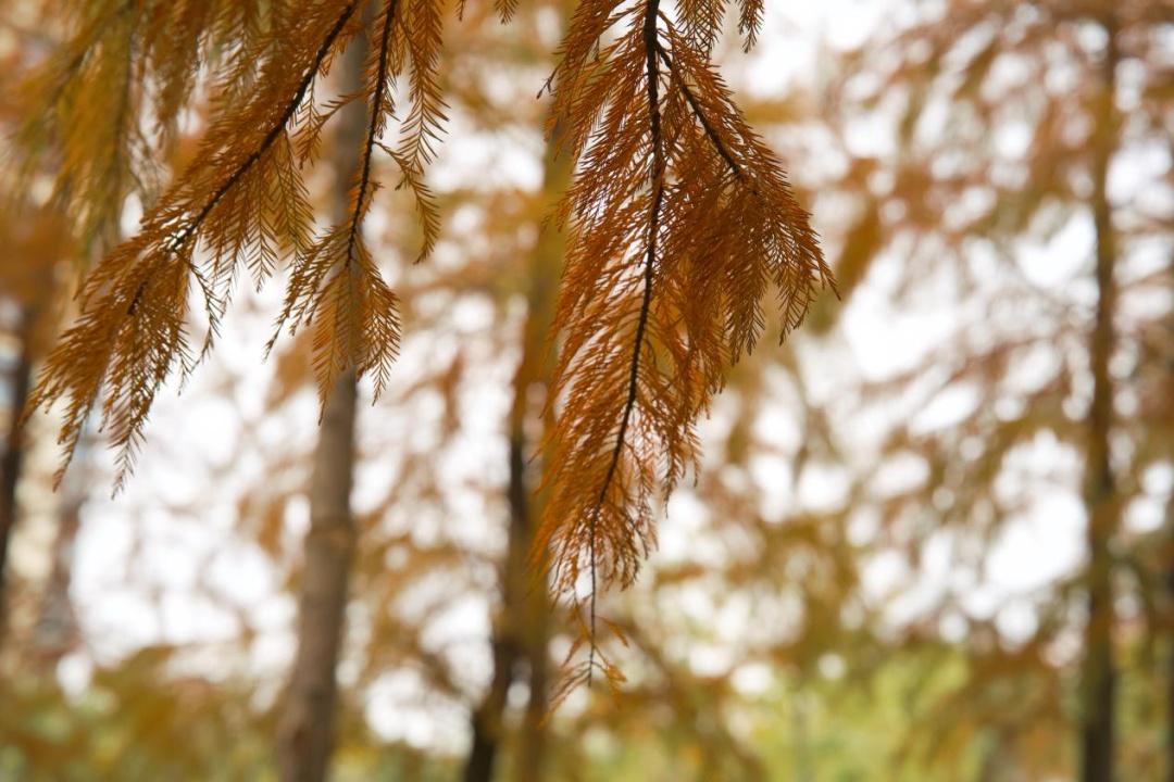 一排排落羽杉像身姿挺拔的卫士,静静伫立。随着季节的深入,落羽杉将逐渐变橘红,再到棕红,最后变成褐色。