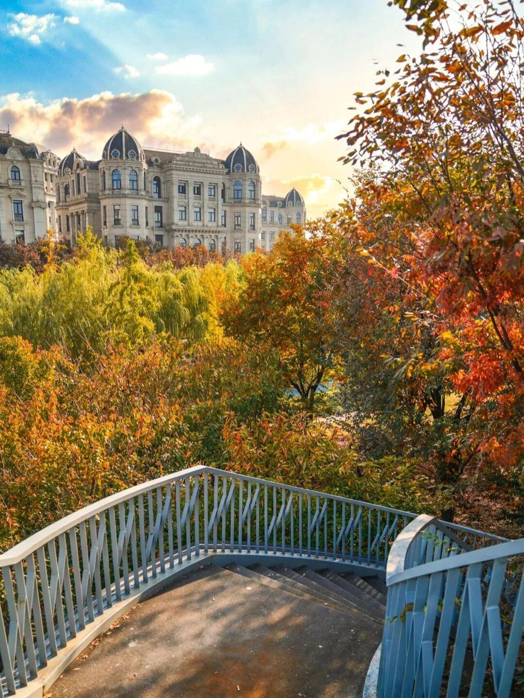 园内最令人惊喜的,是那座已成为“拍照标志景点”的旋转楼梯,在枫叶衬托下极具视觉张力。