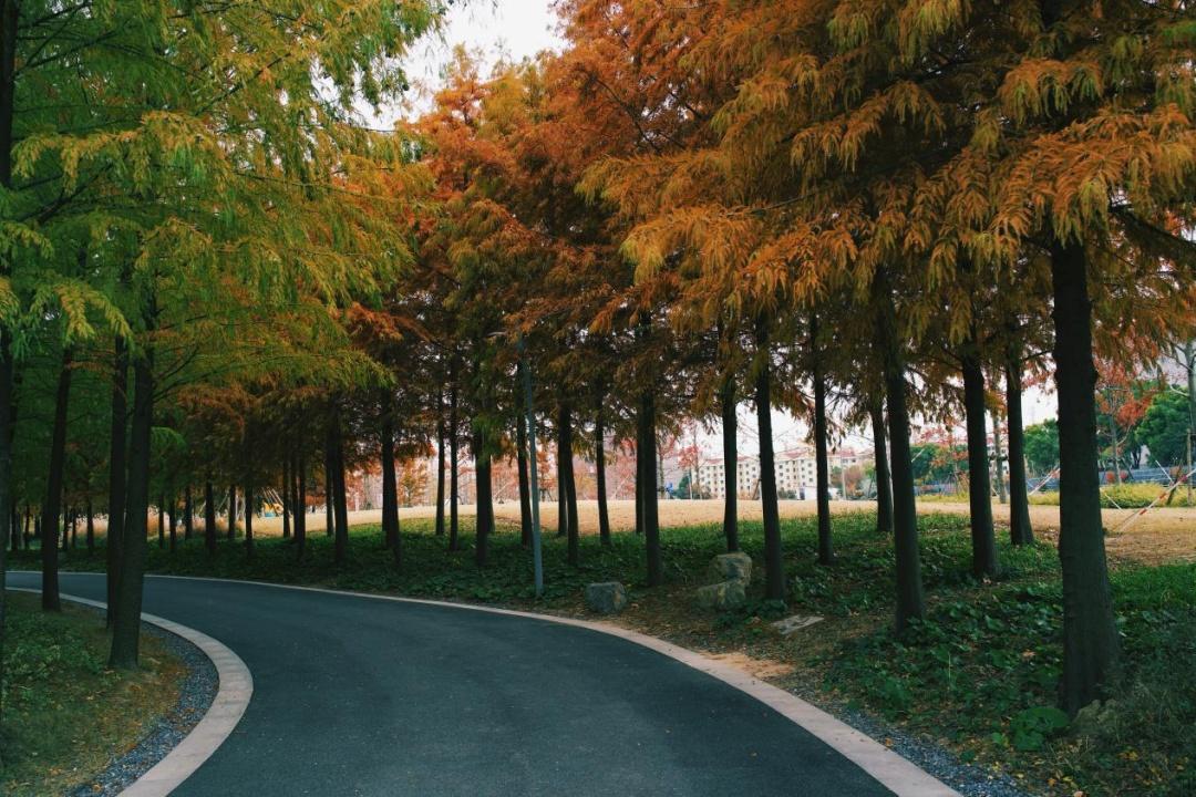 脚下是松软的落叶,耳边是风吹枝叶的沙沙声,落羽杉林,红、黄、绿三色交织,宛如大自然打翻的调色盘。
