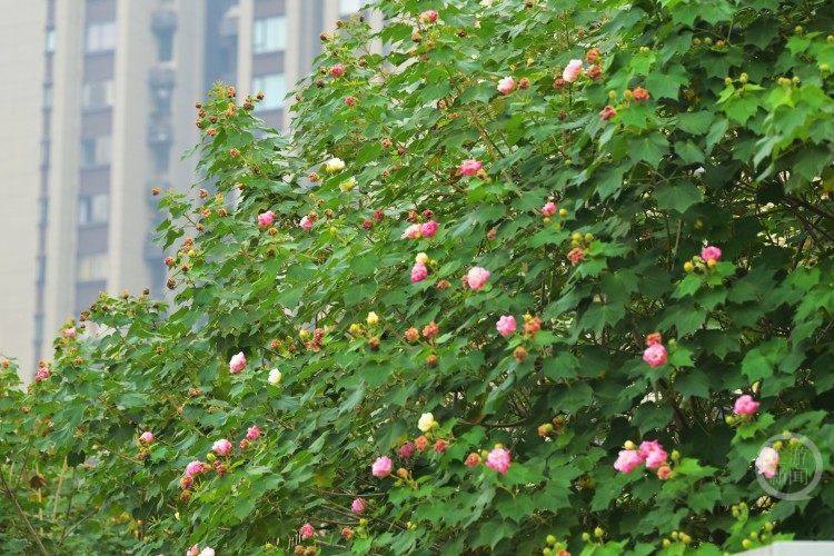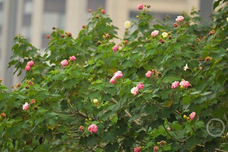 近日,九龙坡区彩云谷国际社区旁一道近百米的木芙蓉花墙迎冬盛放,簇簇繁花将城市街角装点得如诗如画,成为冬日里一道动人的风景线。