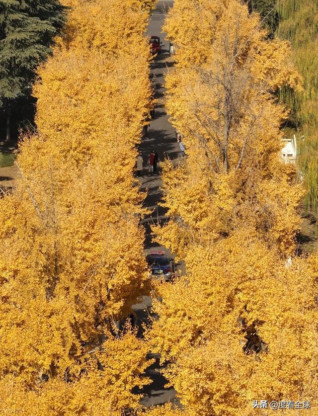 随着太阳逐渐升高,薄雾散去,银杏大道的“真面目”彻底展露。千余株银杏树整齐排列在大道两侧,树干挺拔粗壮,最高的可达20余米,枝繁叶茂的树冠在空中交织,形成一条金色的拱廊。阳光透过叶片的缝隙,在地面上投下密密麻麻的光斑,与地上厚厚的落叶交相辉映,踩上去软绵绵的,仿佛走在金色的地毯上。