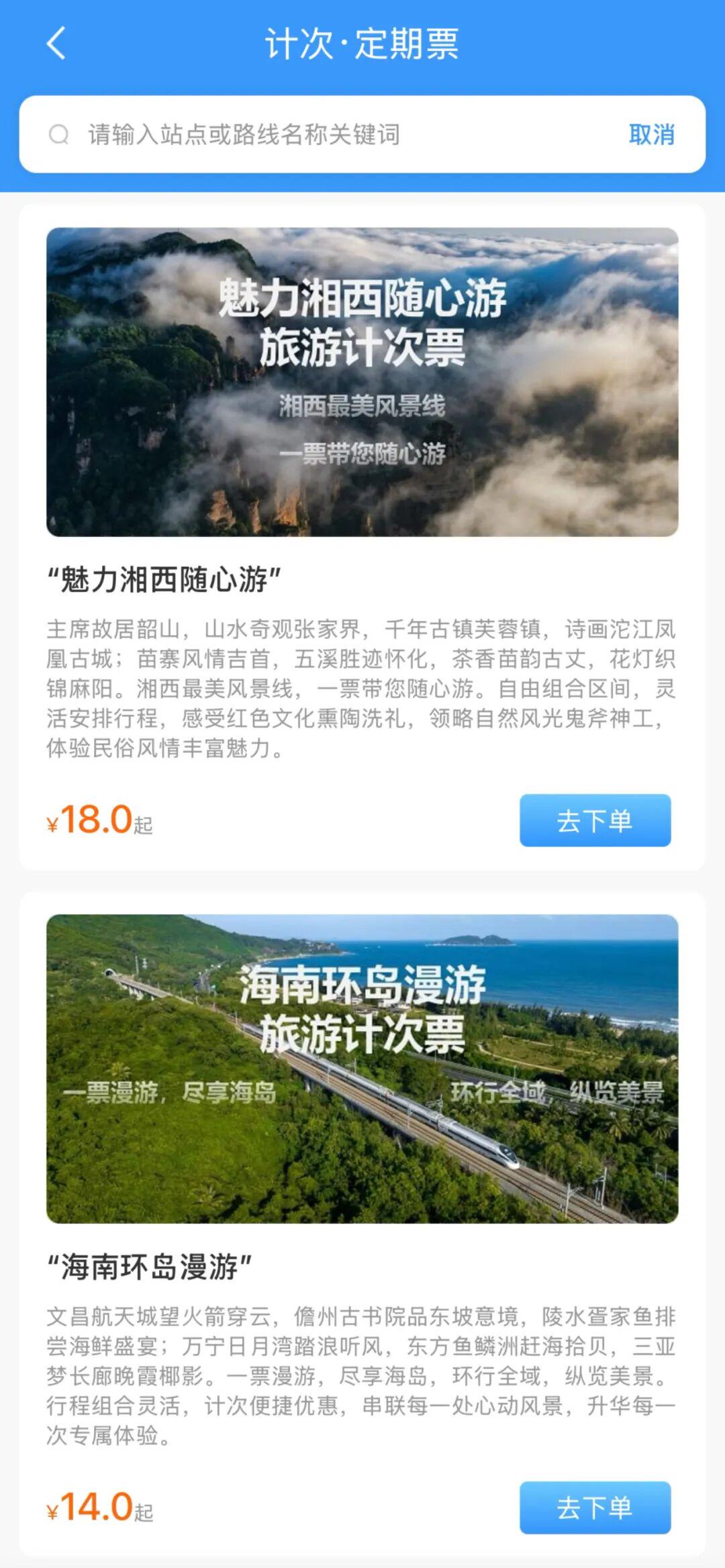 旅客可在铁路12306网站或App的“计次·定期票”板块中选择旅游计次票,其中“海南环岛漫游”计次票14元起,“魅力湘西随心游”计次票18元起。相比于普通的分段式购票,购买该旅游计次票可享受9折优惠。