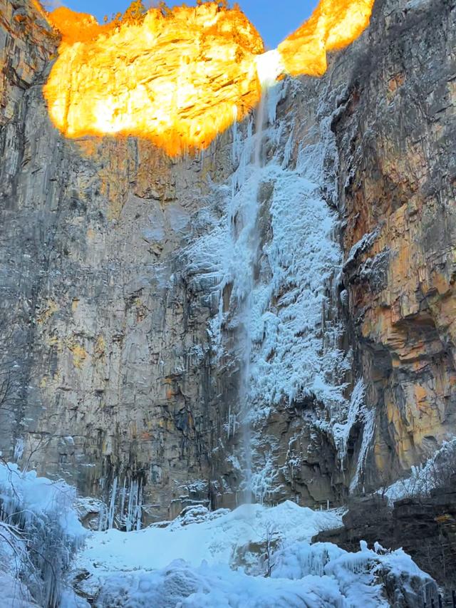 金山冰瀑震撼上线!今年水量充沛,云台天瀑格外壮美。飞流凝作壮丽冰瀑,垂挂峭壁,阳光映照冰晶熠熠如金,与冰瀑相映成画,呈现难得的金山冰瀑奇景。