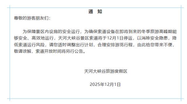 12月1日,记者从天河大峡谷景区了解到,为保障景区内设施的安全运行,确保索道设备在即将到来的冬季旅游高峰期能够安全、高效地运行,天河大峡谷景区索道于今日(12月1日)停运,索道开放时间将另行公告。