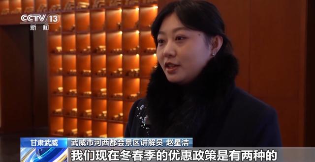 武威市河西都会景区讲解员 赵星洁:我们现在冬春季的优惠政策有两种,第一种是门票半价,第二种就是户口本全家畅游门票,一人买票全家畅游,属于人越多越划算。