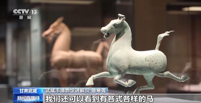 武威市博物馆讲解员 雒寒菁:来到武威,不得不提的就是我们凉州的马文化,这一件就是举世闻名的铜奔马,从正面看也是非常滑稽搞笑的,在这边展柜中我们还可以看到有各式各样的马,其中品相最佳的就是这一件彩绘木马了。它的耳朵尖而小、眼大突如悬铃、鼻大可握拳,这一匹马集西域马、蒙古马、河西走马的优点于一身,史称“凉州大马横行天下”。