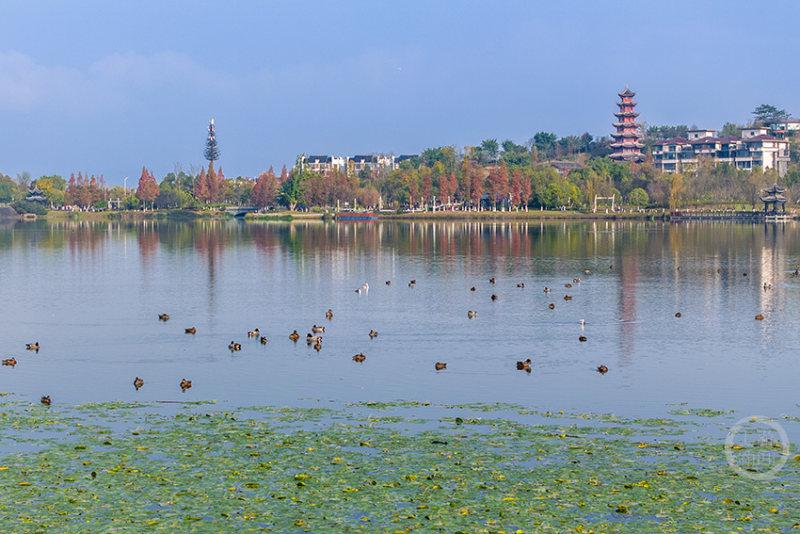 晨曦初露,梁平区双桂湖国家湿地公园候鸟栖息觅食。