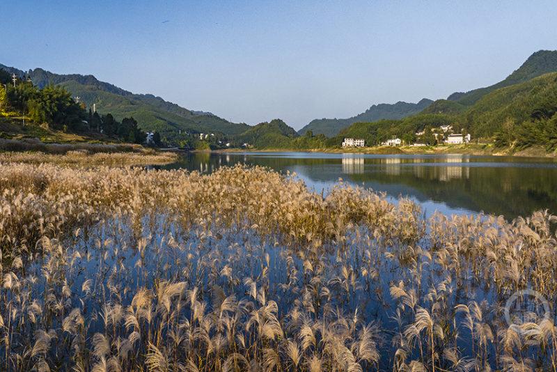 梁平区竹山镇竹风湖,湖畔的芦苇与青山、湖水、农房相映成趣。