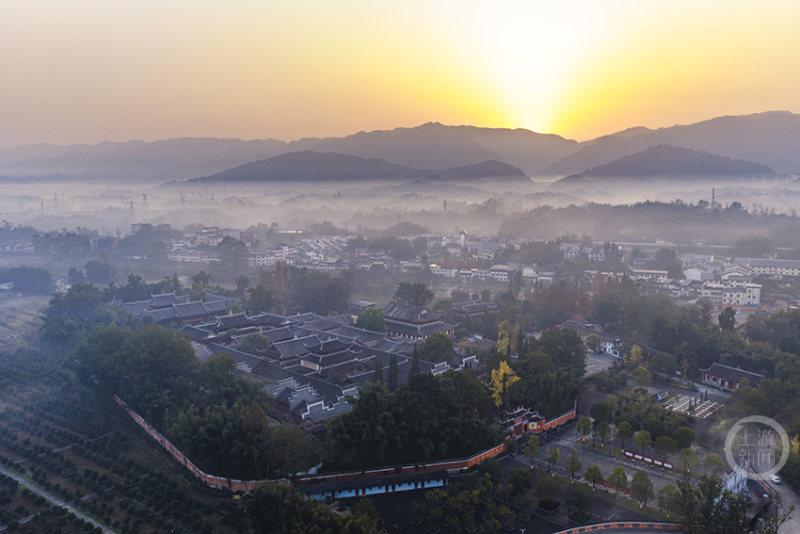 梁平区金带街道,晨曦、薄雾映衬下的双桂堂庄严肃穆。
