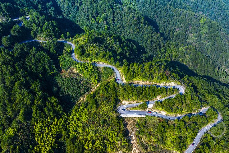 梁平区新盛镇,旅游公路如玉带般在山脊上蜿蜒而上,促进当地经济发展。