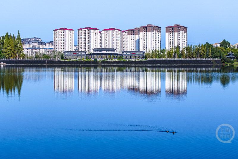 梁平区双桂湖国家湿地公园,蓝天白云,碧水相映,候鸟在此栖息觅食,构成一幅美丽的绿色生态画卷。