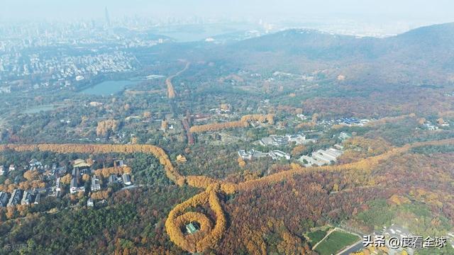 随着太阳逐渐升高,薄雾散去,梧桐大道的“金项链”全貌逐渐显现。尤其是环绕美龄宫的路段,更是将“项链”的形态展现得淋漓尽致。从高空视角望去,金黄的梧桐大道蜿蜒曲折,形成一个完美的圆形,美龄宫坐落于圆形的中心,青瓦红墙在金黄树叶的映衬下,显得格外典雅庄重。这一独特的景观并非天然形成,而是蕴含着老一辈建筑师的匠心巧思。上世纪三十年代,美龄宫建成时,周边便开始种植法国梧桐,经过近百年的培育,才形成了如今这“项链环绕宝石”的绝美景观。