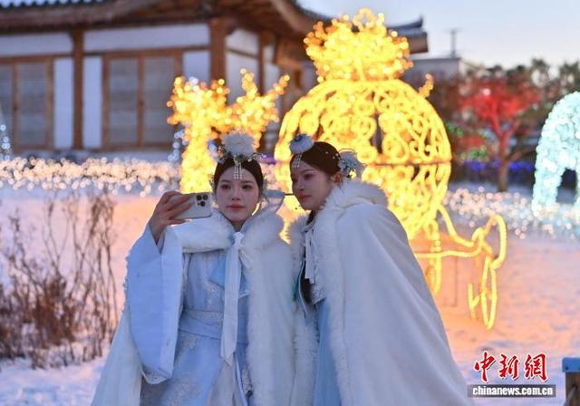 12月2日,在吉林省延边州延吉市中国朝鲜族民俗园内,游客身着朝鲜族服饰拍照。作为中国唯一的朝鲜族自治州和最大朝鲜族聚居地,延边近年旅游热度持续攀升,朝鲜族服饰旅拍已成为当地最受欢迎的旅游体验之一。尽管遭遇降温降雪天气,游客热情依然不减,在银装素裹的园中定格独具民族风情的画面。中新社记者 张瑶 摄