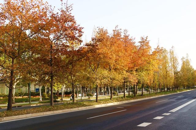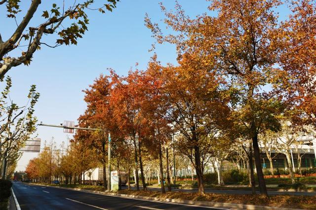 不只是联通普陀、宝山与长宁的交通干道,也是一条流动的风景线。路旁树木整齐排列,枝叶仍缀满鲜活绿意,零星橙黄点缀其间,未见萧索、更显生机。偶尔一阵风过,几片彩叶翩跹而落,为繁忙的城市节奏添上一笔温柔注脚,让通勤之路也浸润着自然的清新。