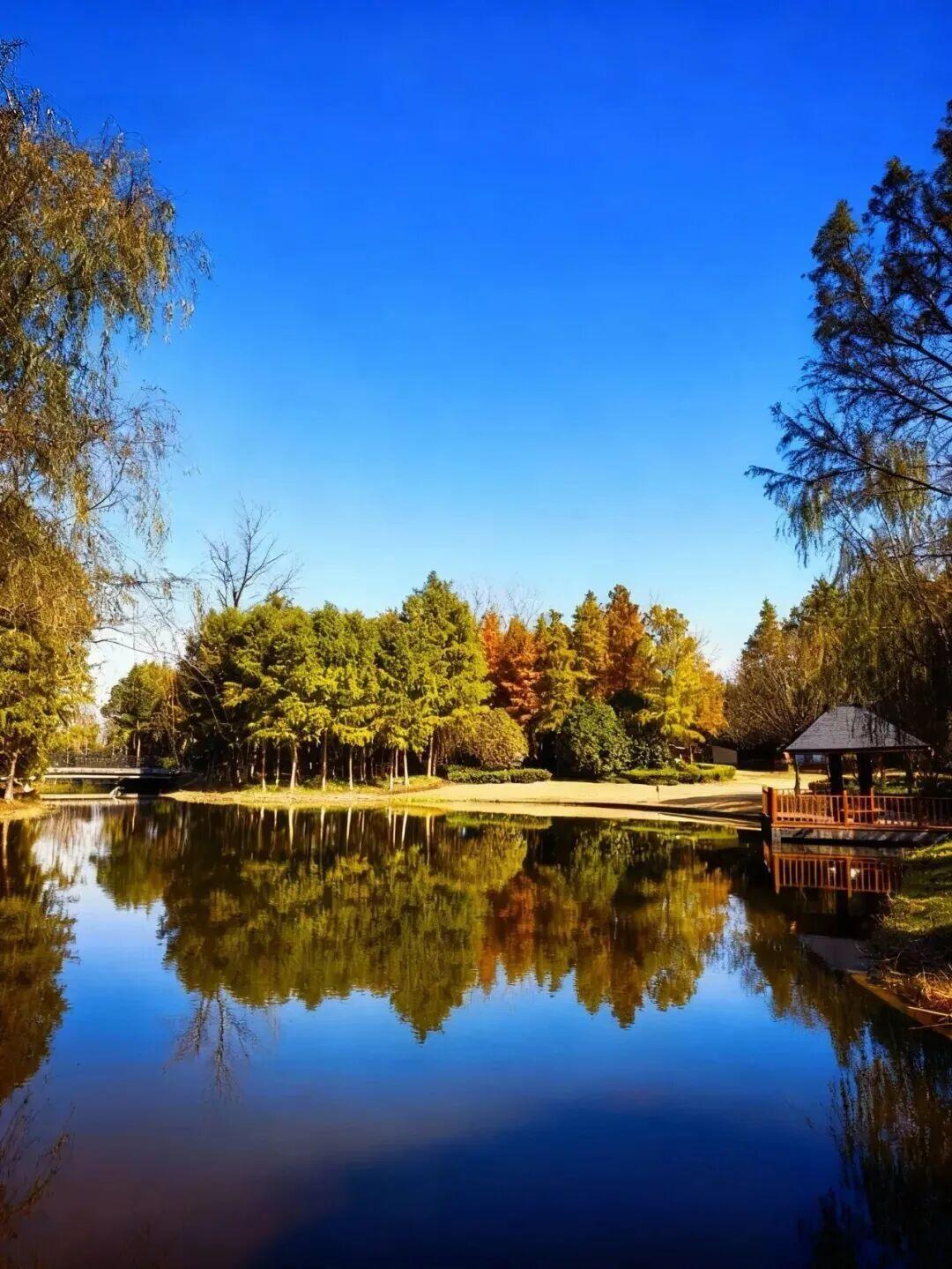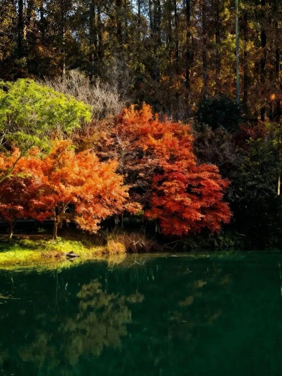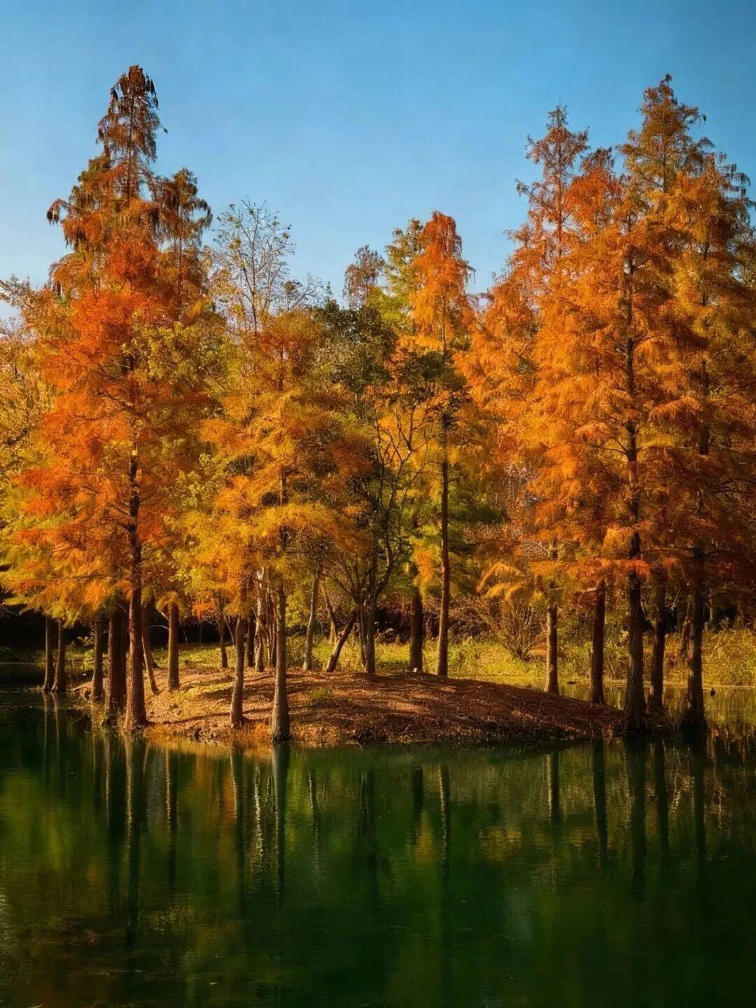 赏景正当时。11月下旬至12月上旬,这里迎来了最佳观赏期——水杉似火、银杏如金、红枫燃情,深红、明黄与墨绿交织成油画,湖面映着斑斓树影,随手拍都是冬日大片。