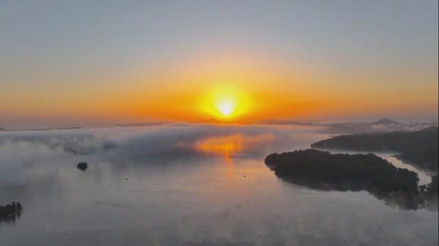 原标题:江西新余:雾锁仙湖迎日出 金光漫洒入画来