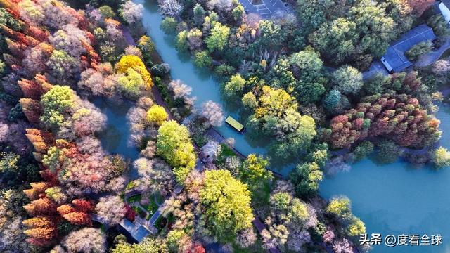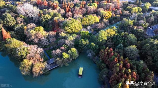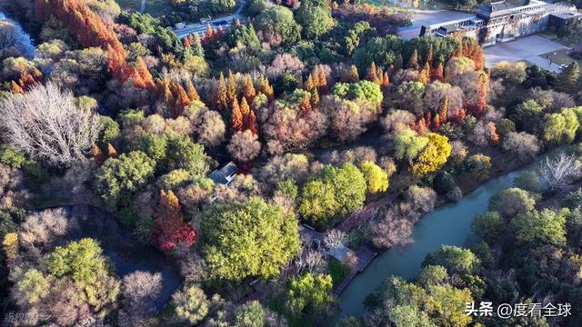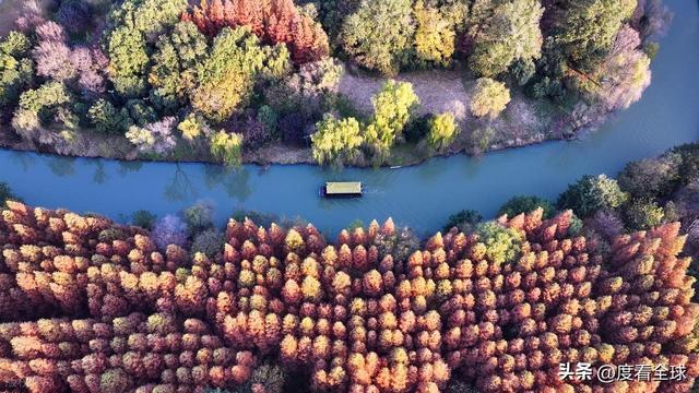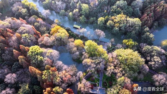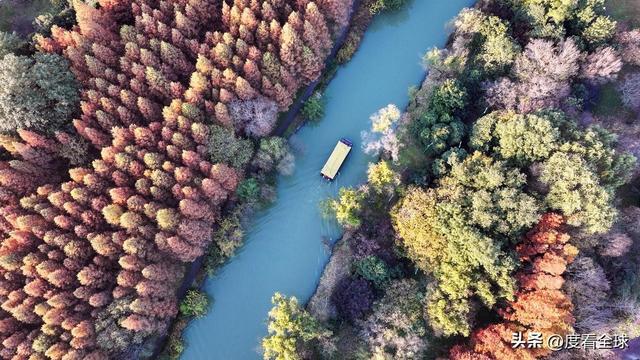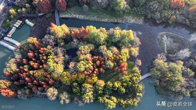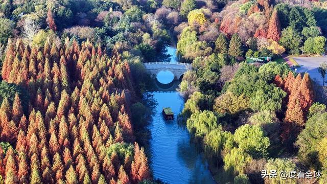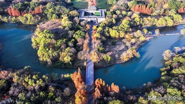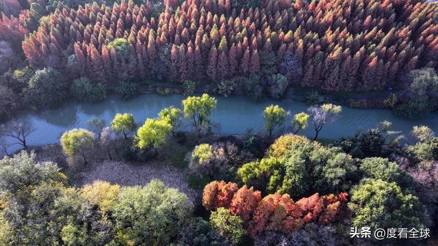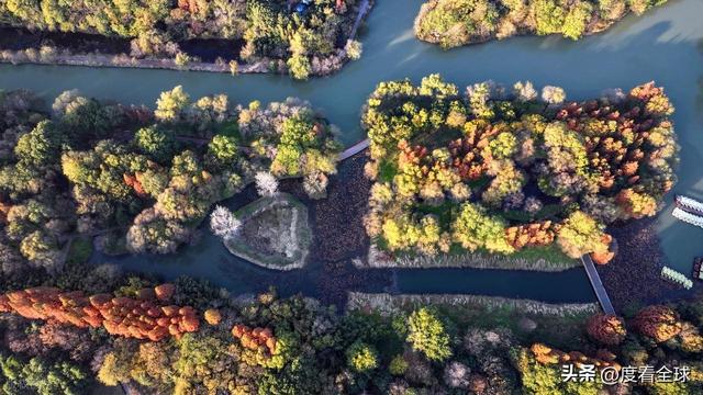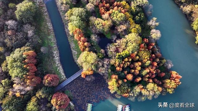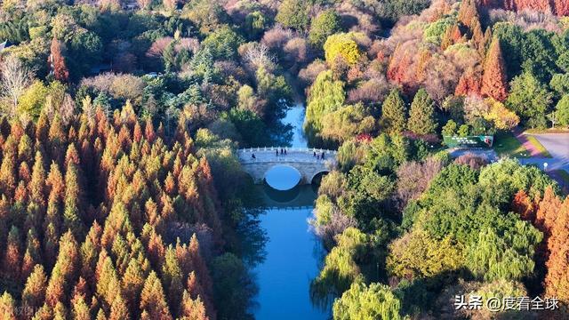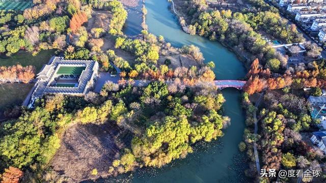 空中视角下的宋夹城,更是展现出令人震撼的美。从高空俯瞰,整个公园被彩色的植被覆盖,落羽红杉林形成大片的红色区域,如同一块巨大的红宝石;梧桐大道则如一条金色的丝带,环绕在湖边;银杏林则点缀其间,增添了更多的色彩层次。园区内的湖泊如镜面般平静,倒映着岸边的彩林,水天一色,斑斓多姿。不少无人机爱好者专程来到这里,操控着无人机拍摄这绝美的景致,他们拍摄的视频在社交平台发布后,迅速引发热议,不少网友留言“太惊艳了!这就是扬州的冬日浪漫吗?”“周末就出发,去宋夹城赴一场色彩之约”。