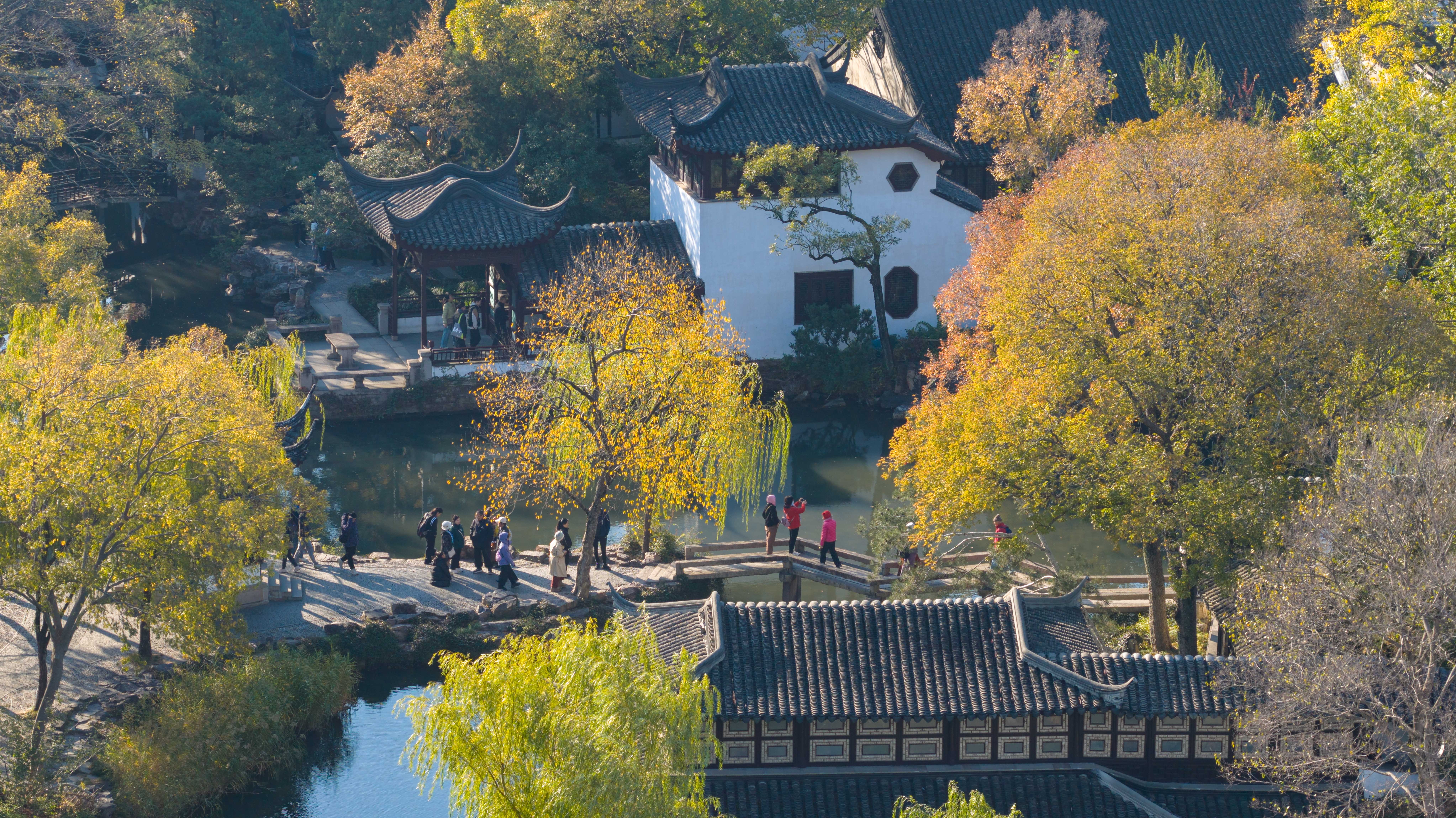 11月19日,游客在江苏省苏州市拙政园游玩(无人机照片)。新华社发(王须中摄)