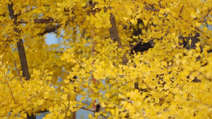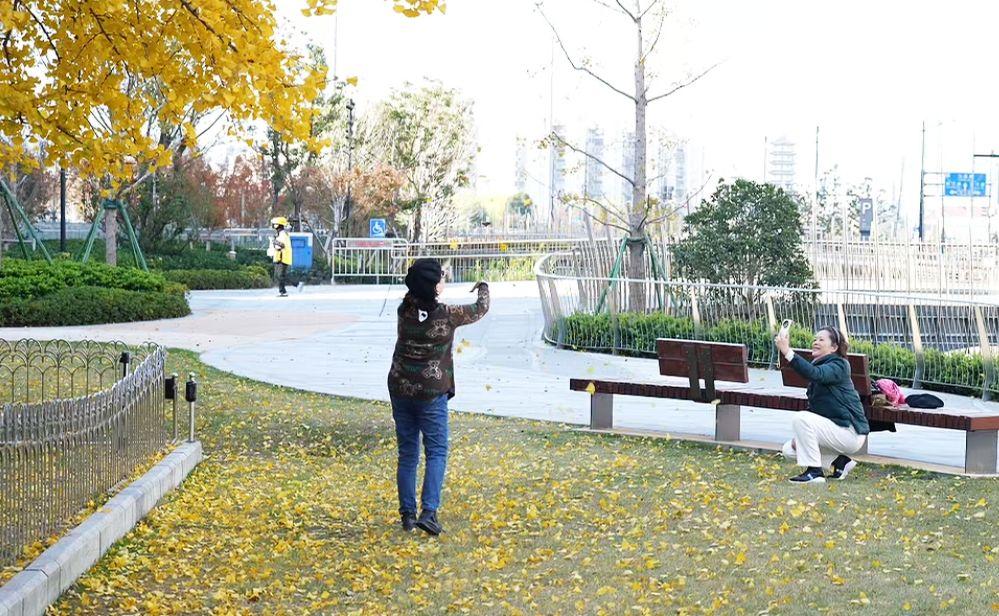 对于附近的居民而言,这棵树不仅是景观,更是生活的一部分——每年这个时节,金黄的叶片随风飘落,在广场地面铺就一层松软的地毯,吸引着散步的居民放慢脚步。许多居民每年都会来看看这棵树,“之前颜色还是蛮青的,今天看已经是金黄色的了,现在是银杏最漂亮的时间。你看它的树根,要几个人才围得住,一般的银杏没有这个效果。”