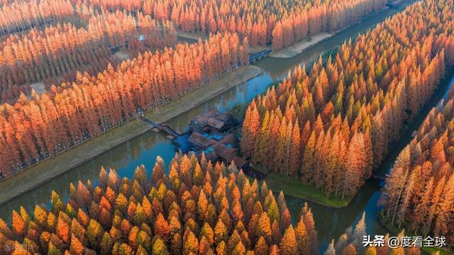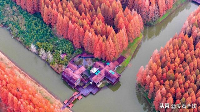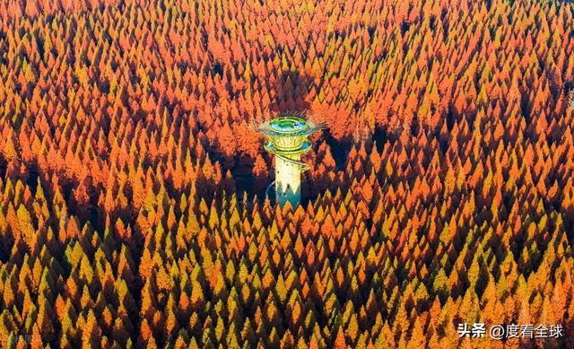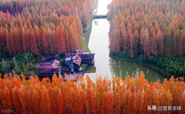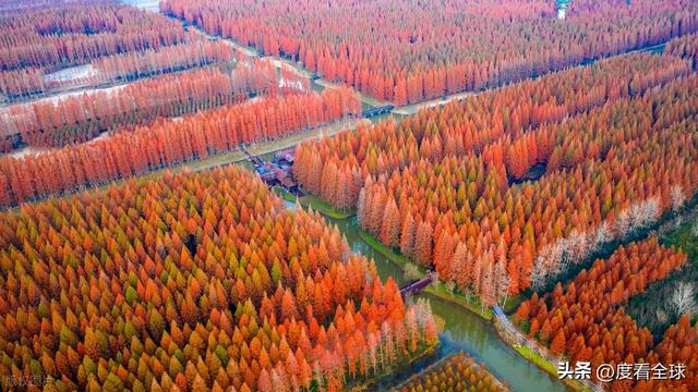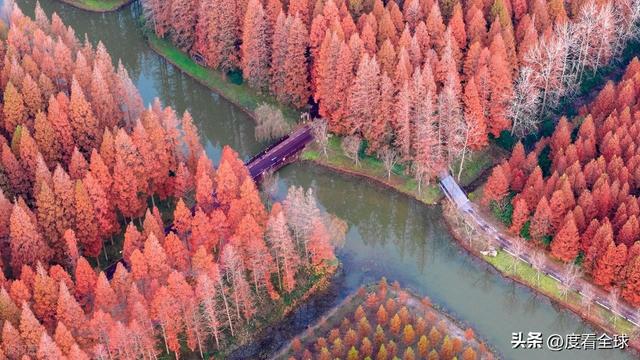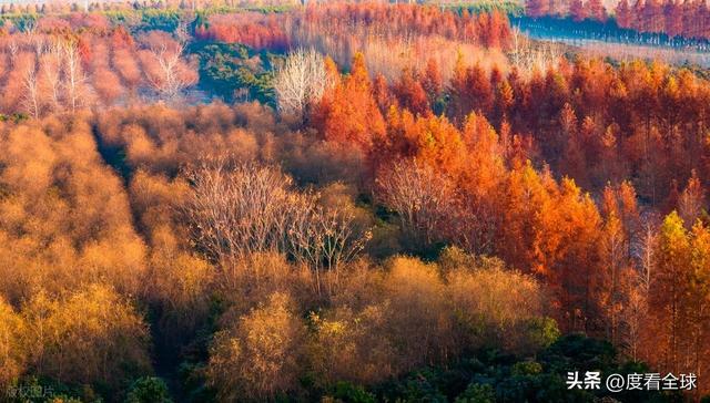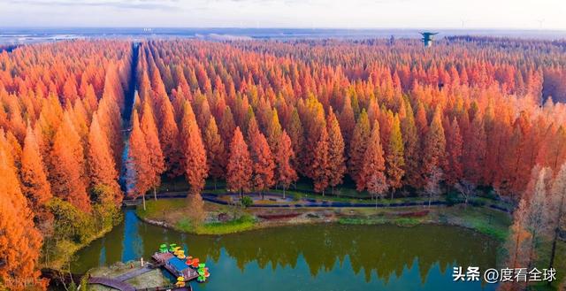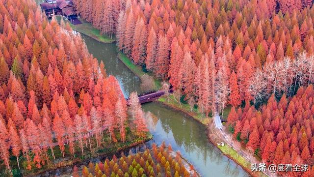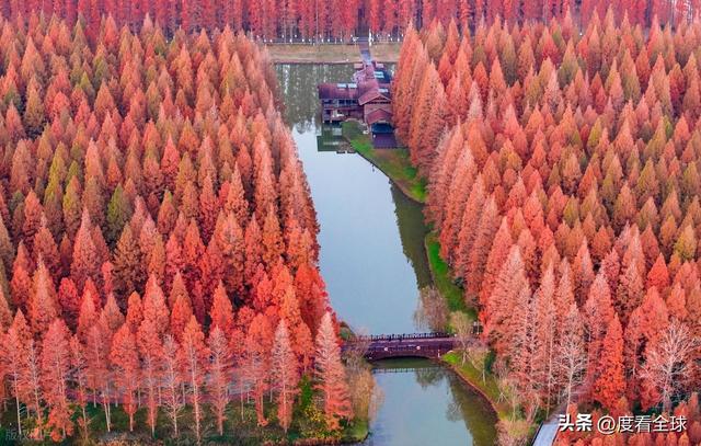 作为江苏最大的水杉种植基地,东台黄海国家森林公园的水杉林有着独一无二的魅力。不同于其他地区的红叶景观,这里的水杉在霜雪的洗礼下,叶片会逐渐从翠绿过渡到金黄,最终定格为热烈的铁红色。万亩水杉连成一片,绵延数里,远远望去,就像一片无边无际的红色海洋,气势恢宏又不失细腻柔美。