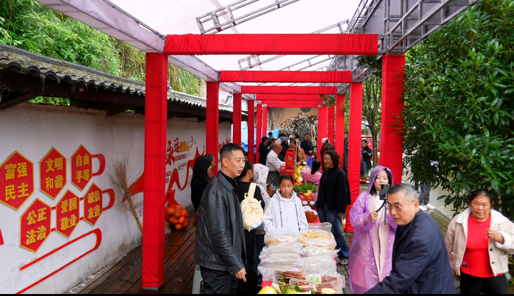 “山里寻常东西,真能变成钱?”村民们最初的疑问迅速被火爆的场面打消。活动期间,红薯、土豆、咸菜、腊肉、柚子……家家户户把能摆的都摆了出来,整个古寨的农特产品销售额突破了80万元。