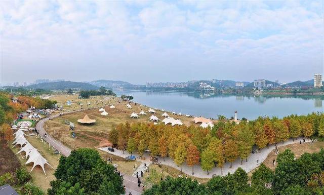 12月4日,记者来到灵龟山滨江公园,看到沿江的落羽杉林已经成了拍照打卡圣地。叶片如羽毛般的落羽杉色彩斑斓,红的炫目,橙的耀眼,绿的盎然……像是被打翻了调色盘,美不胜收。沿江的草坪、天幕、木屋与木头栈道相映成趣,不少市民趁着秋意正浓,三五成群地露营、野餐、品尝、赏景,在自然的怀抱中放慢脚步。