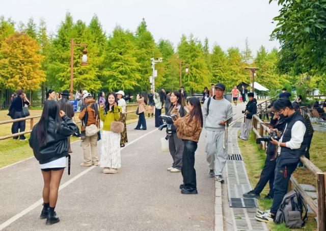 木头栈道、蜿蜒曲折,人在落羽杉林中漫步,以小木屋、木头栅栏为伴,远眺层林尽染、绿水青山……一张张唯美浪漫的无滤镜的镜头被一一定格,成为了城市的“天然取景棚”,不少市民更是惊叹:“原相机直出都美得不像话!”