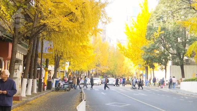 每年12月,文林街的银杏便到了“高光时刻”。清晨的阳光透过银杏枝桠洒下,把原本泛黄的叶片照得透亮,像缀满枝头的小金片,风一吹,叶子便打着旋儿落下,在柏油路上铺上一层“金毯”,踩上去满是细碎的声响。