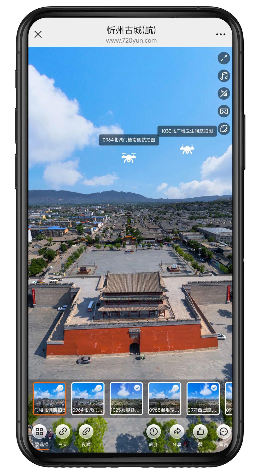 无需远行,便能沉浸式饱览晋北风情;不必久候,即可零距离对话千年文脉。日景、夜景、航拍三种模式可供选择,720°全方位实景展示。推开这扇无形城门,赴一场与历史、故乡、美景的云端之约。