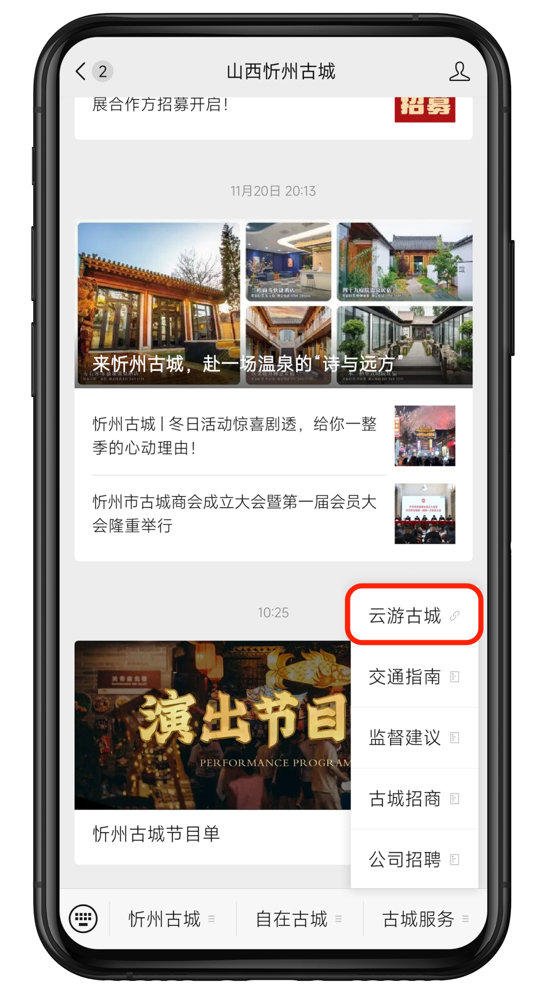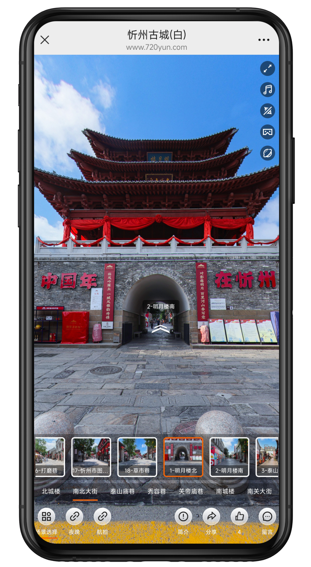 关注忻州古城官方微信公众号,进入会话页面,点击“古城服务”快捷栏目,进入“云游古城”VR小程序便可开启你的云游之旅~