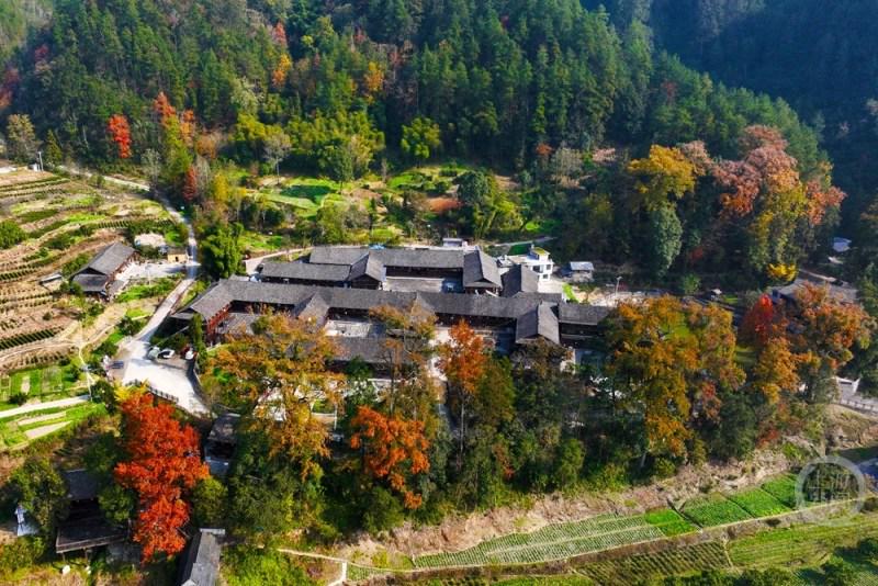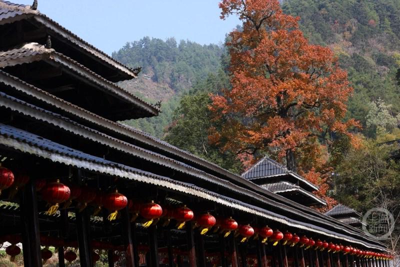 初冬时节,重庆市黔江区小南海镇桥梁村,枫林掩映着古枫寨风雨廊桥的一角。