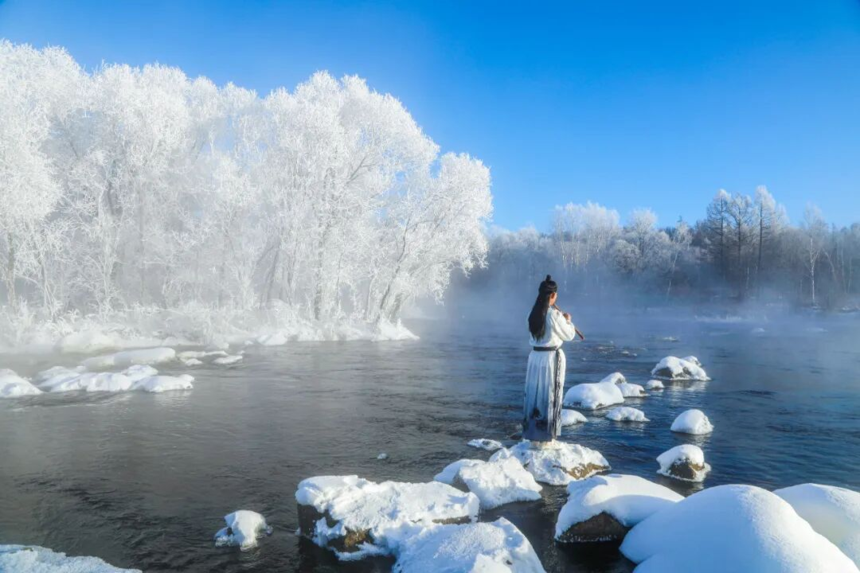 清晨是大自然的杰作展厅,东方晨曦初露,天地间已铺展开圣洁奇异的冰雪画卷,琼枝玉树间的雾凇玲珑剔透,在晨光中闪烁着细碎光泽。库尔滨河两岸,各类树木挂满雪白雾凇,流动的河水如黑色绸带蜿蜒向前,与岸边银装素裹的树林相映成趣,构成如诗如画的“雾凇画廊”。软软绵绵的雾凇通透雅致,灌木丛在冰雪点缀下更显晶莹,让驻足观赏的游客沉醉于这如梦似幻的纯净世界。