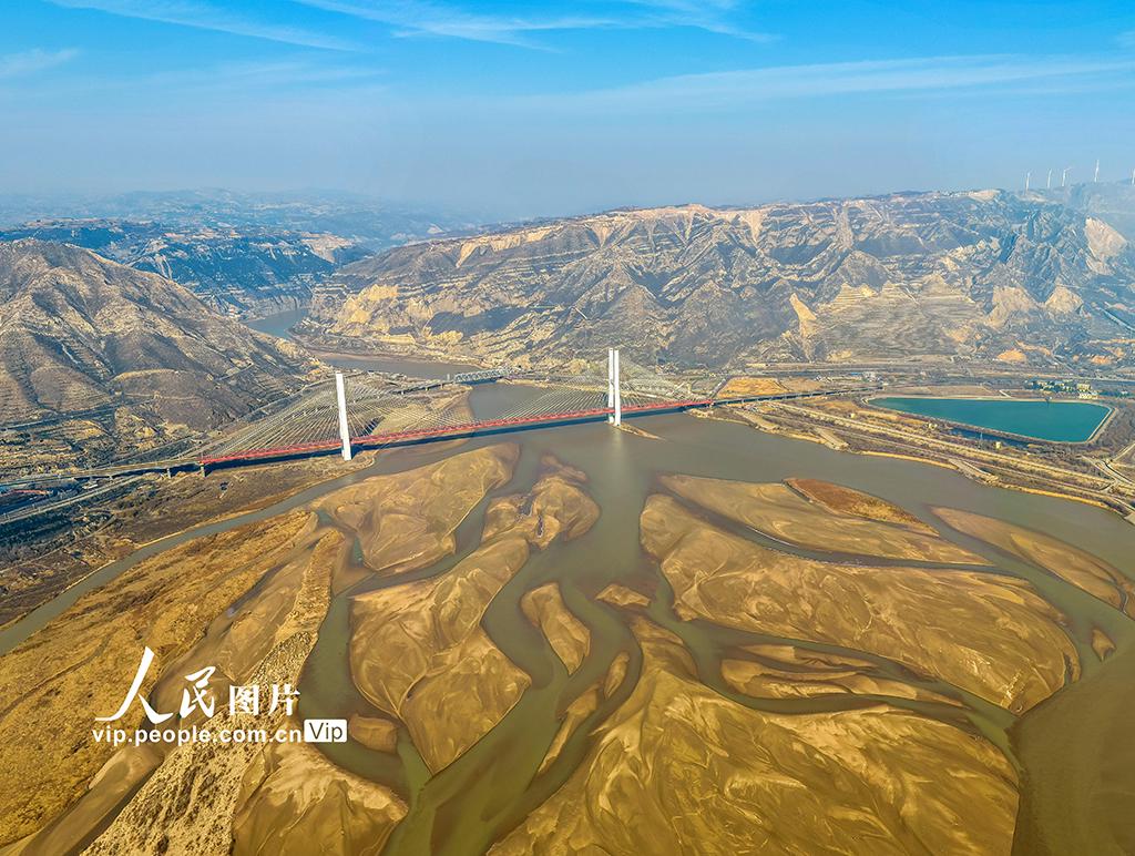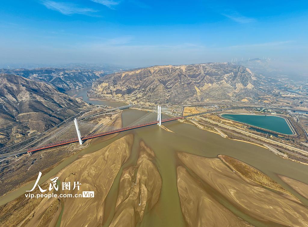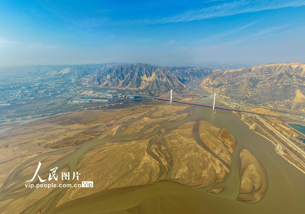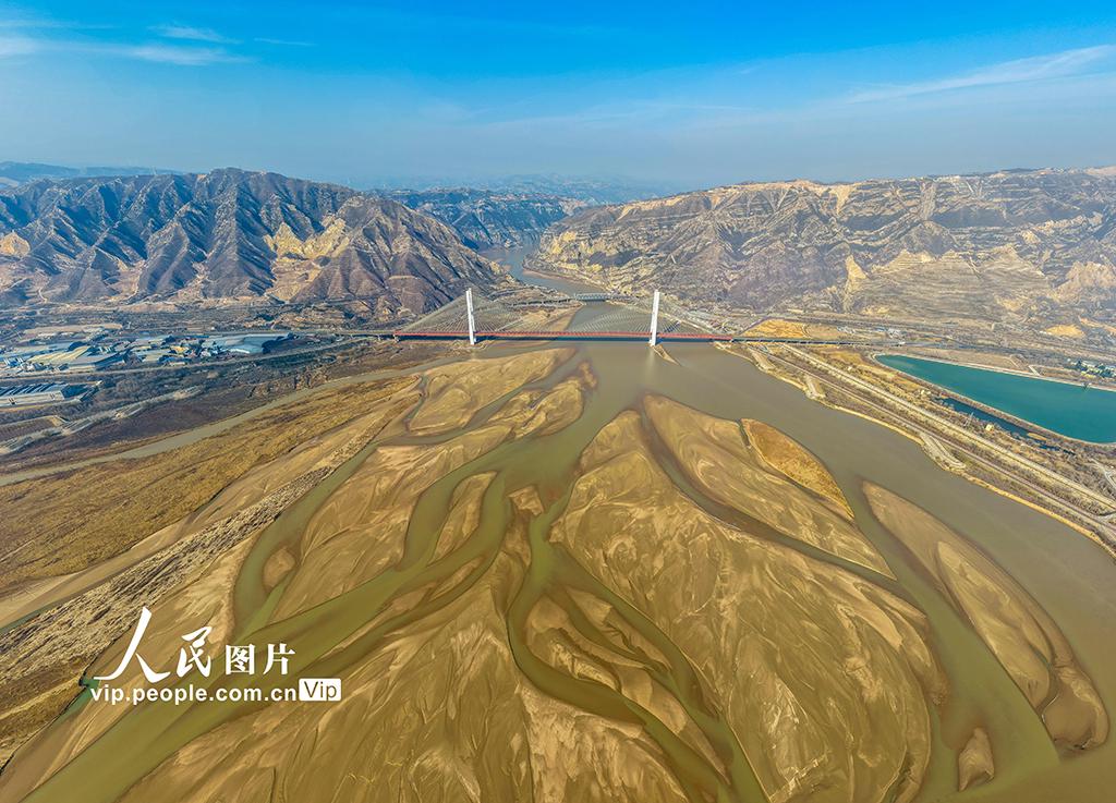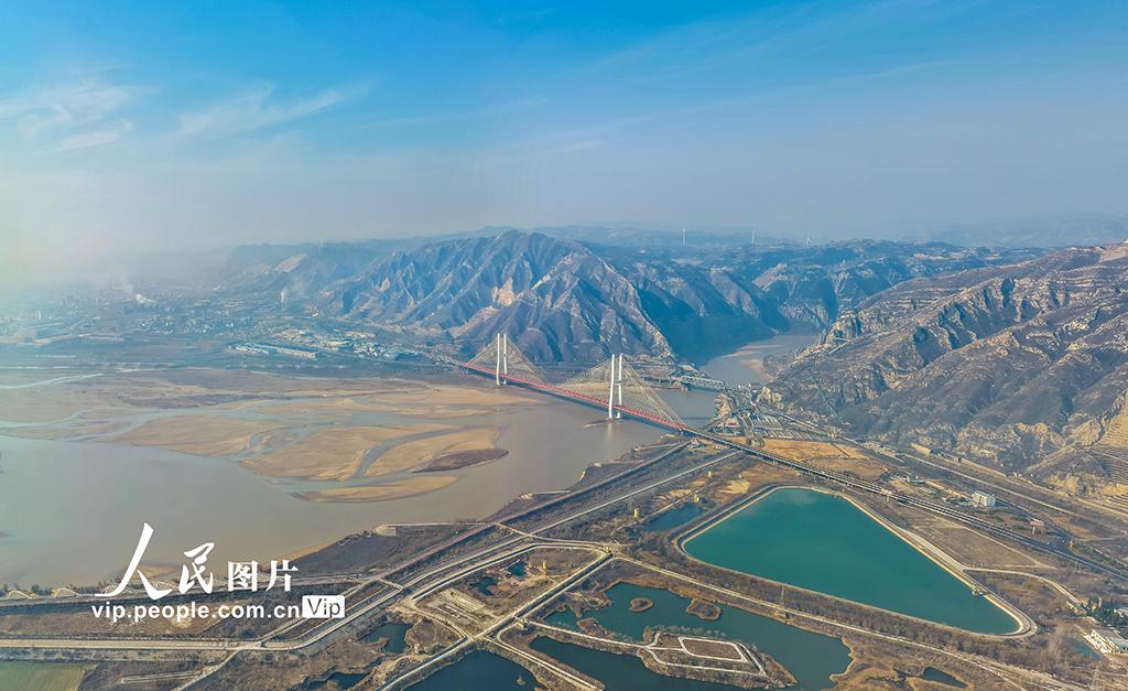 2025年12月9日,山西省运城市河津市境内,冬日黄河在黄河大桥、山峦、河床的映衬下,构成一幅美丽的画卷。闫鑫摄(人民图片网)