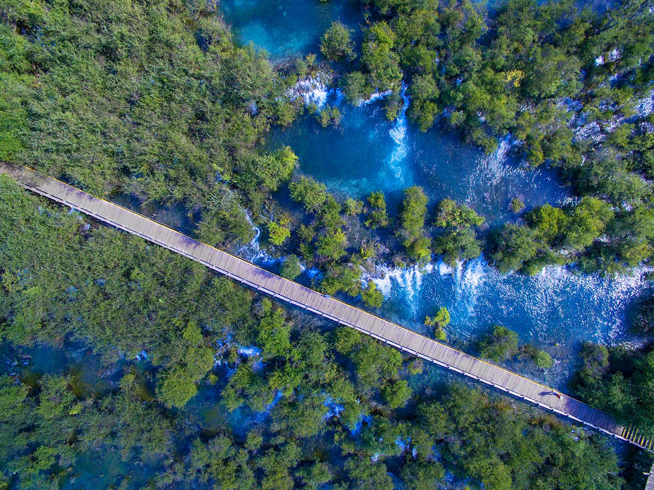 文中提到,“五花海也许是九寨沟最上镜的瑰宝,湖面闪烁着绿松石色、蓝宝石色和祖母绿的光芒。周围森林里各种颜色的树木倒影于湖水中,用柔和的色彩勾勒一幅幅美丽的画面。九寨沟的景观如此超现实,像是虚构出来的一个属于神话传说而非现实的地方。”