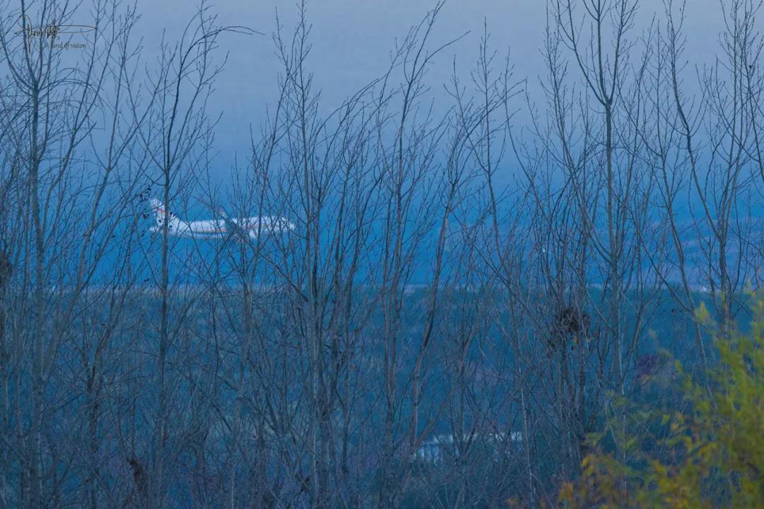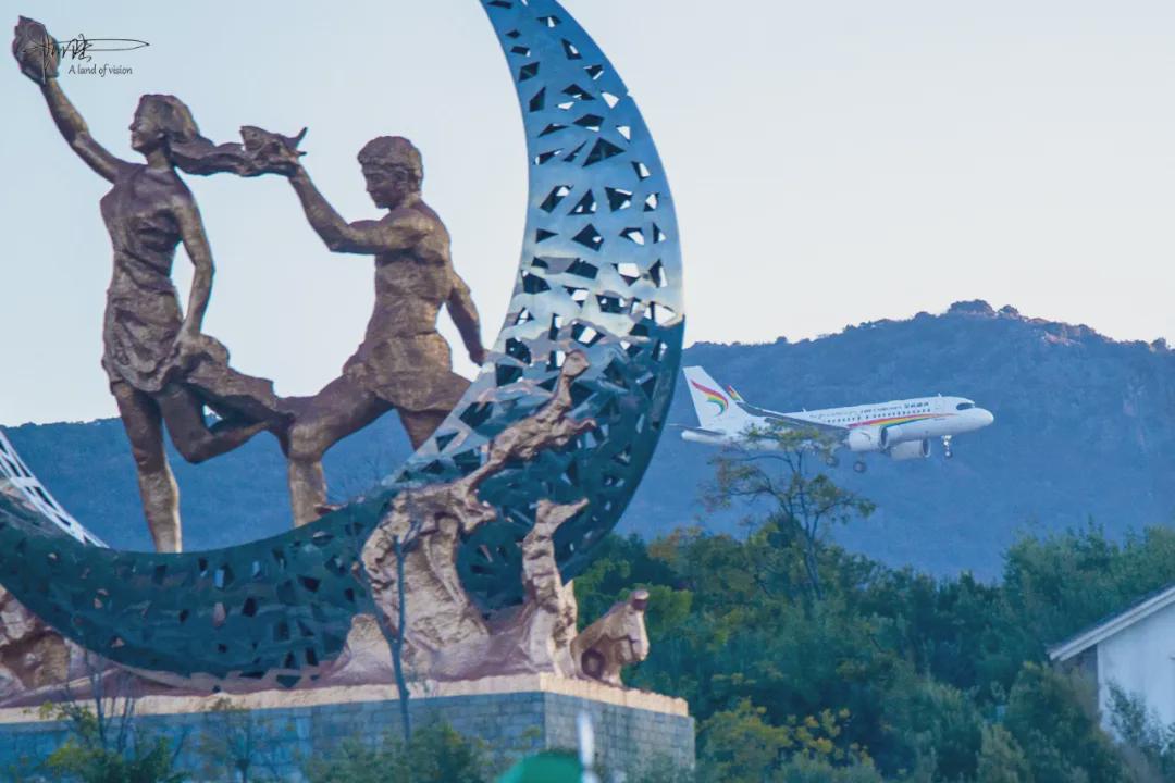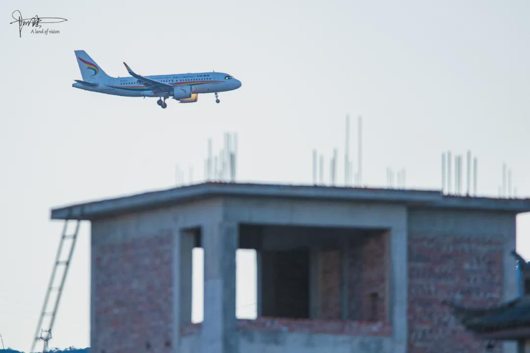 只要经过过机场路或者部分环海东路,相信很多人都看见过大飞机从侧面自上而下划过一条斜线趋于降落的场景吧?像我这天就是刚好在环海东路和机场路交界处的湿地公园打卡,不经意的回头就发现了它,可惜没有准备,等反应过来后马上抓拍,结果还是晚了一点。于是又阴差阳错地把路边特色民宿的人造景观及小树林当作了前景,倒也算是“机缘巧合吧”。