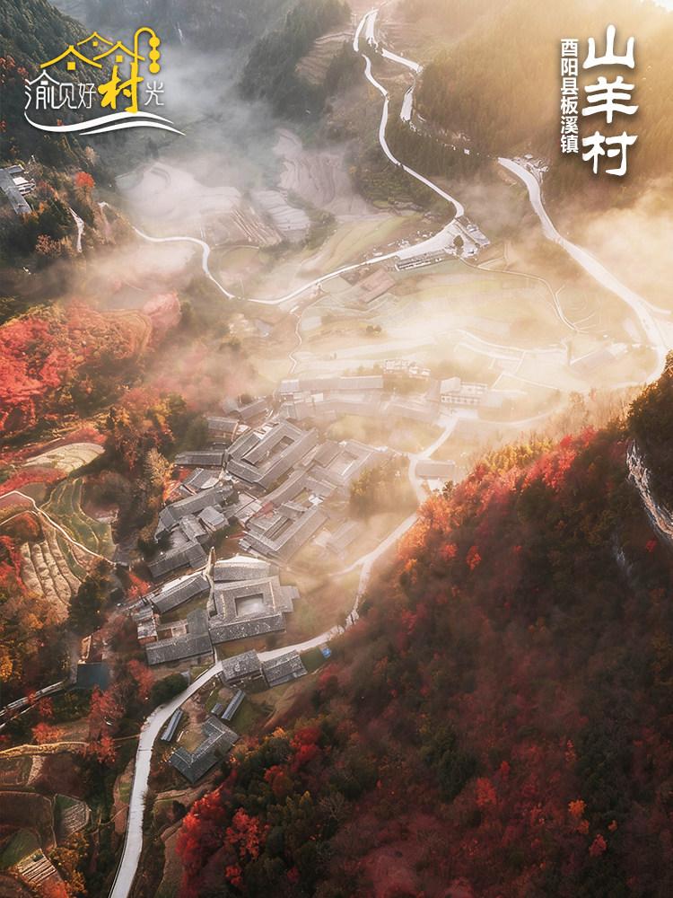 藏在酉阳东南彩林腹地的山羊古寨,隶属板溪镇山羊村,是国家级传统村落,也是重庆秋日红叶版图上最浓烈的一笔。每到深秋,50平方公里黄栌林漫山泼彩,赤橙黄紫交织如画,古寨依山而建,吊脚楼、四合院隐于斑斓林海,仿佛一首写在山间的田园诗。