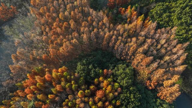 12月9日,松江区米市渡松南郊野公园迎来了水杉林的最佳观赏期。成片水杉已褪去翠绿,换上五彩斑斓的"冬装",从金黄到橙红再到深赭,层层递进的色彩交织成一幅绚丽油画,吸引众多市民游客前来沉浸式体验这短暂的自然盛宴。